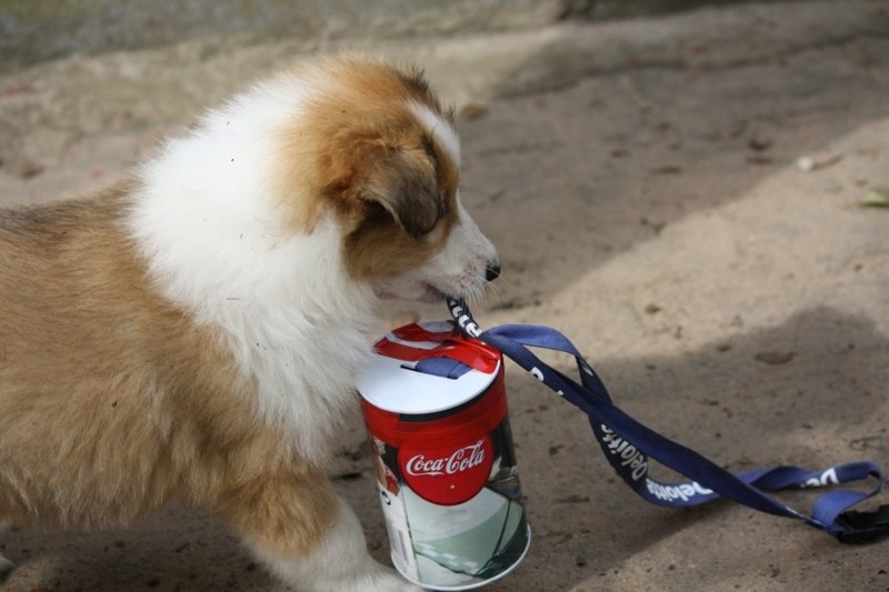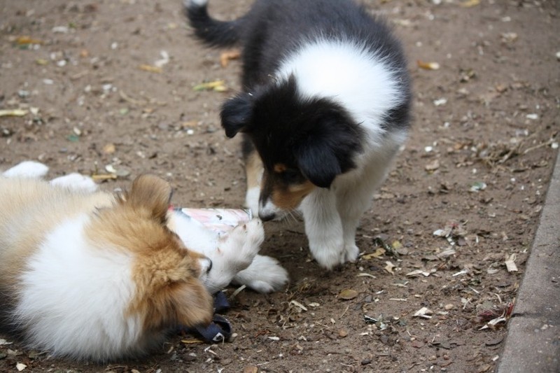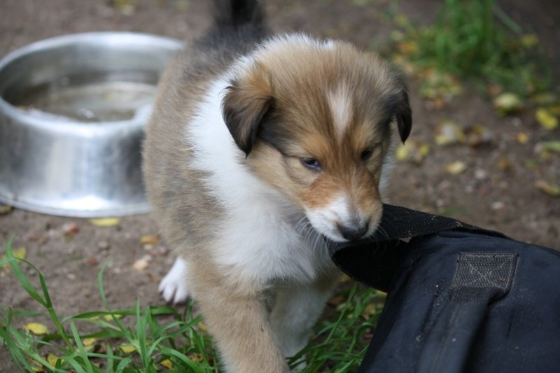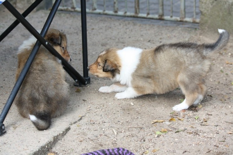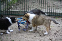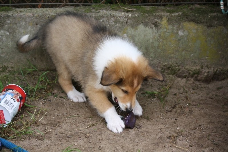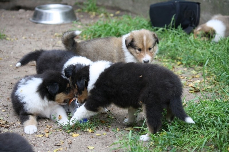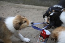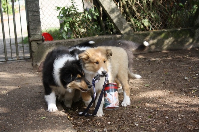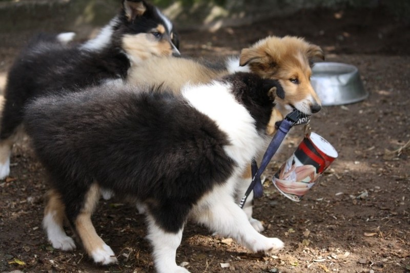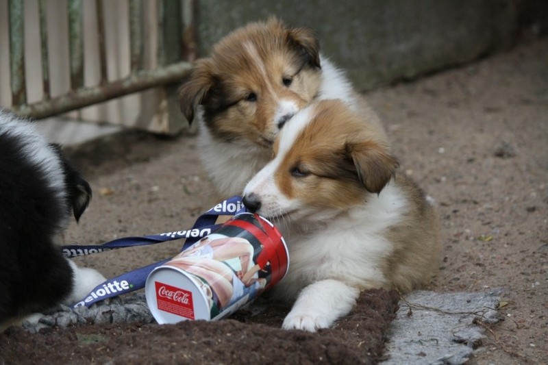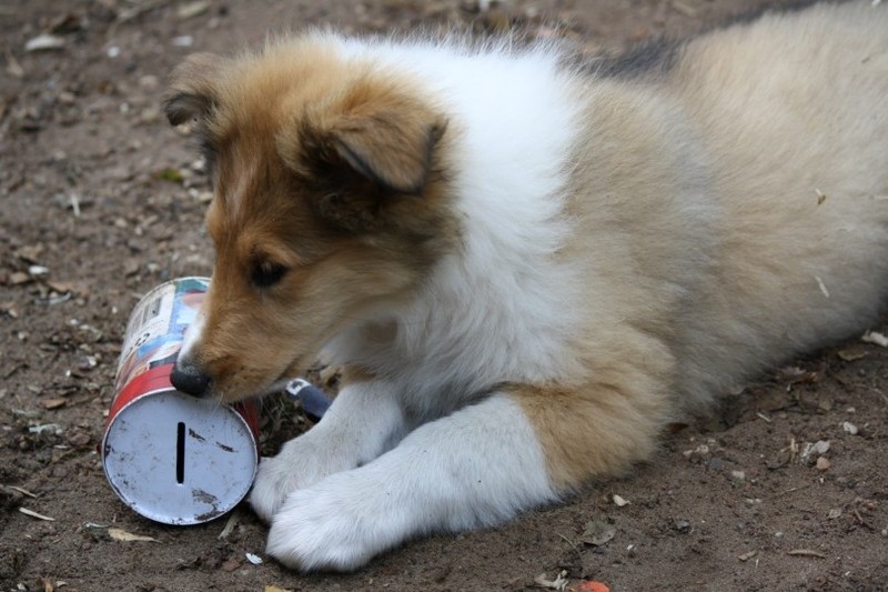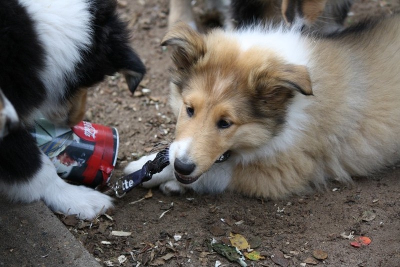 Dann gab es ein tolles neues Spielie. Eine scheppernde Büchse an einem Band an dem mehrere Welpen gleichzeitig ziehen können. Damit sind sie dann begeistert und wild durch die Gegend getobt. Am Ende hat Xperia (Nr.5) die Büchse zum Solokampf mit aufs Zimmer genommen und dort völlig abgedreht.