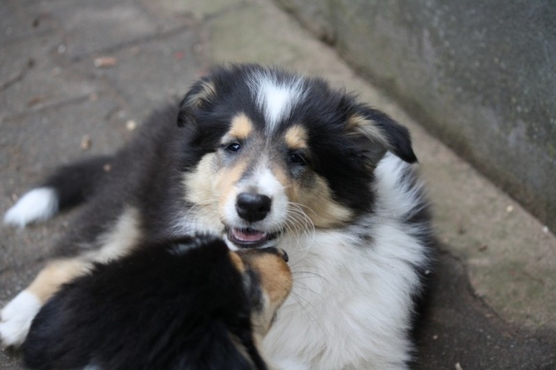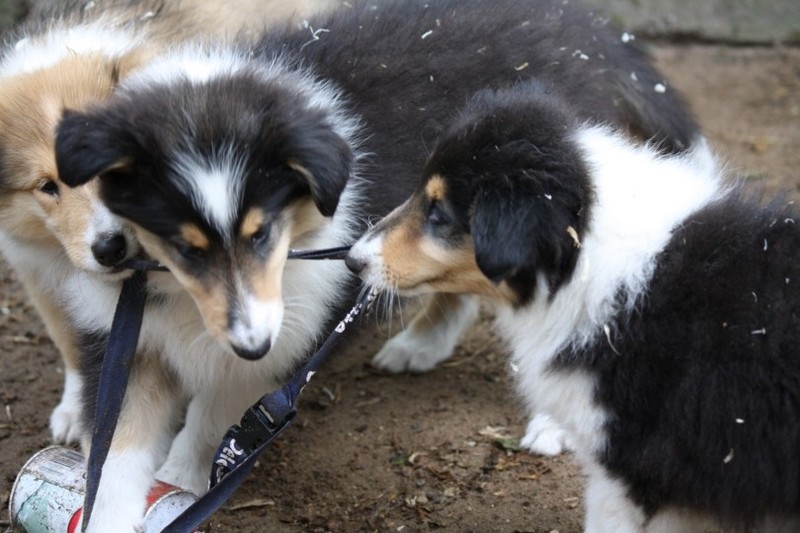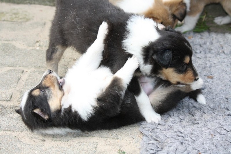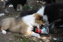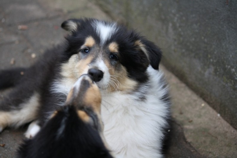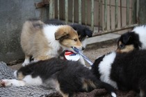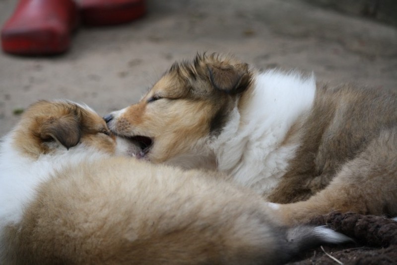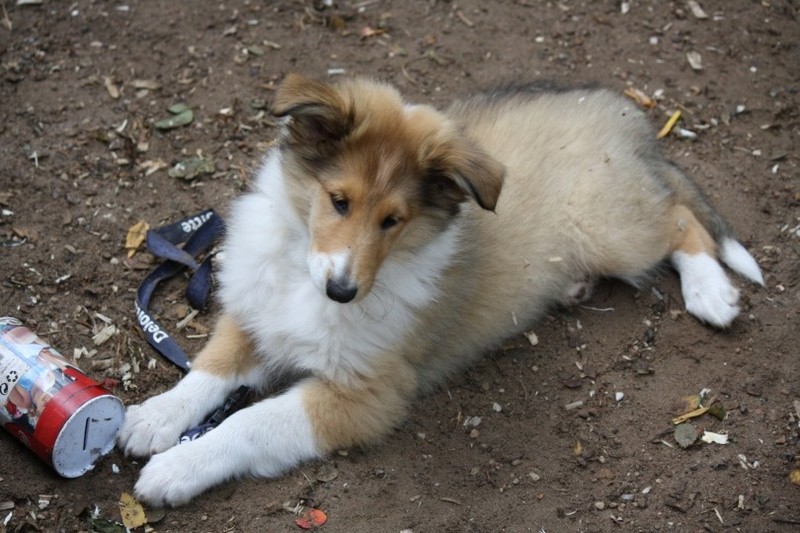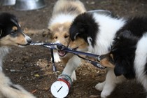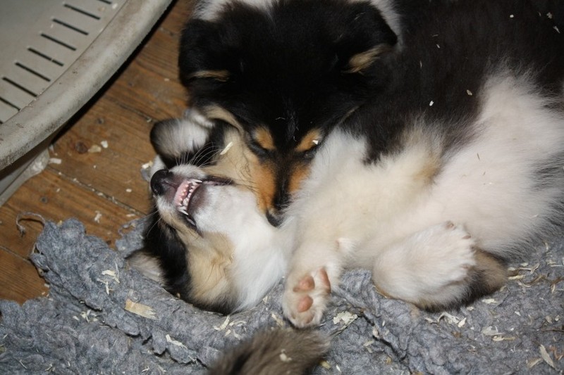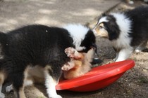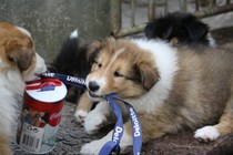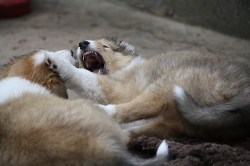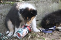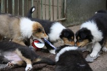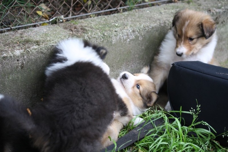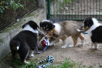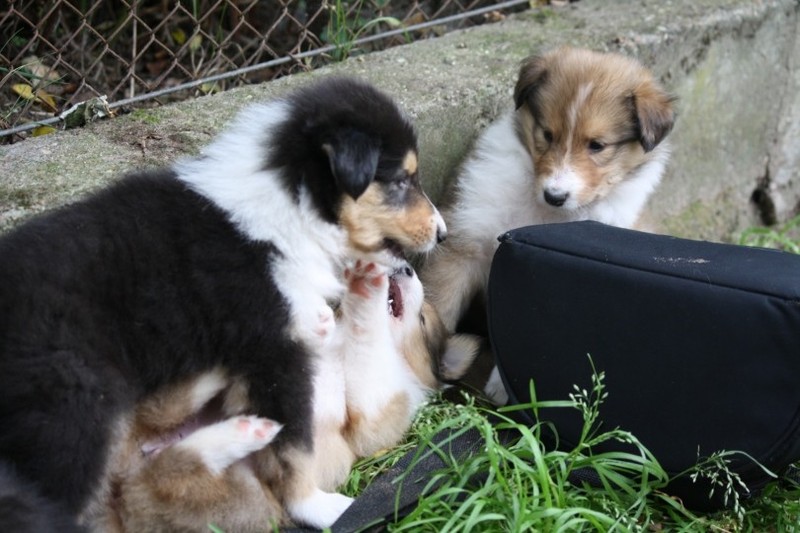 Dann gab es ein tolles neues Spielie. Eine scheppernde Büchse an einem Band an dem mehrere Welpen gleichzeitig ziehen können. Damit sind sie dann begeistert und wild durch die Gegend getobt. Am Ende hat Xperia (Nr.5) die Büchse zum Solokampf mit aufs Zimmer genommen und dort völlig abgedreht.