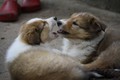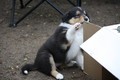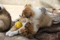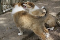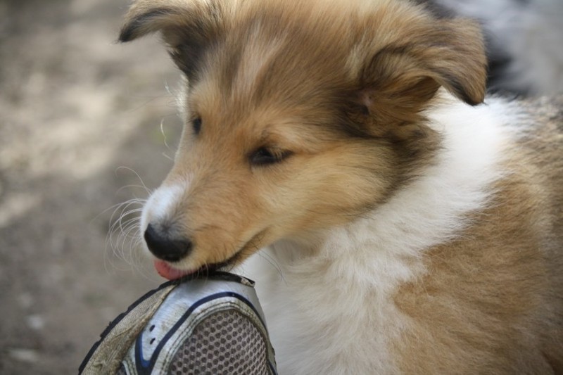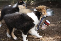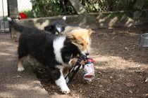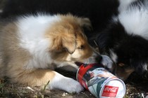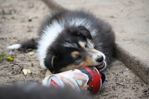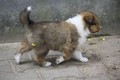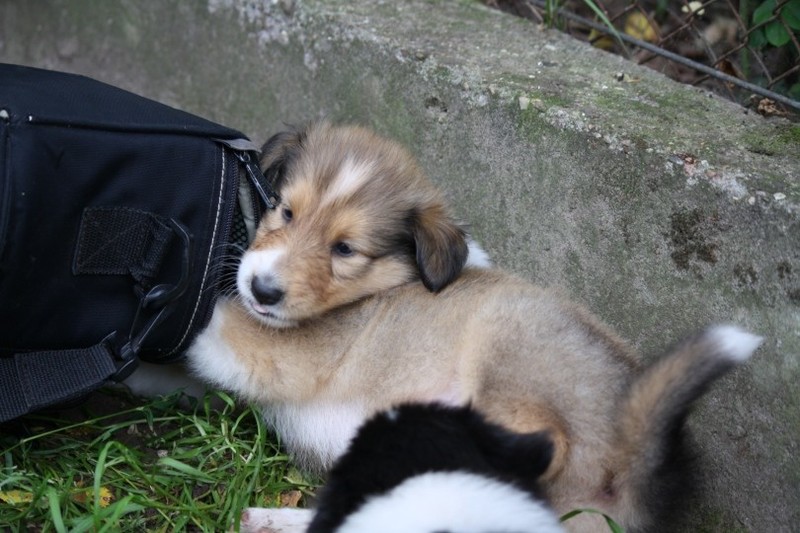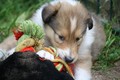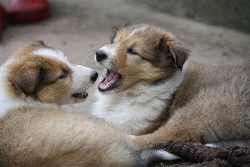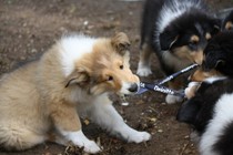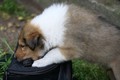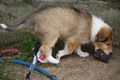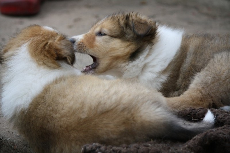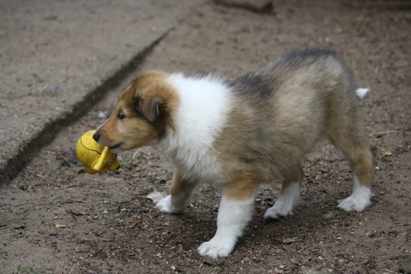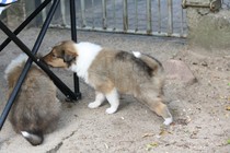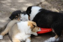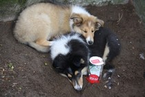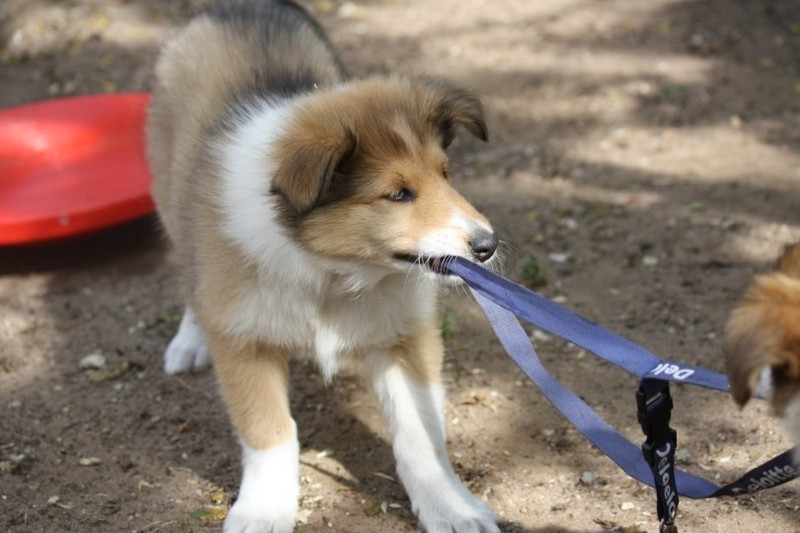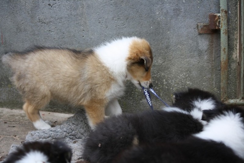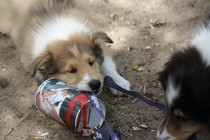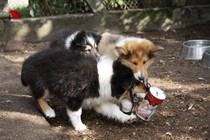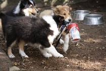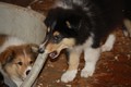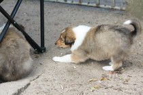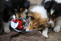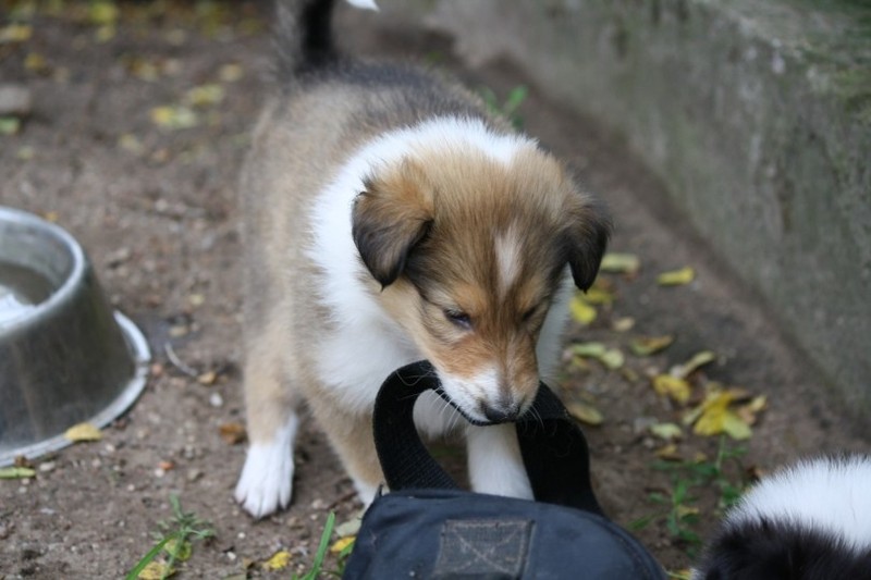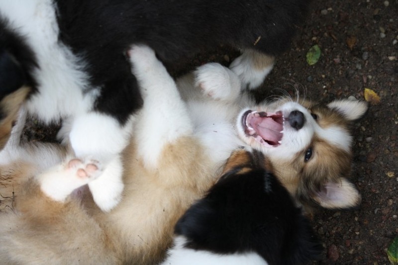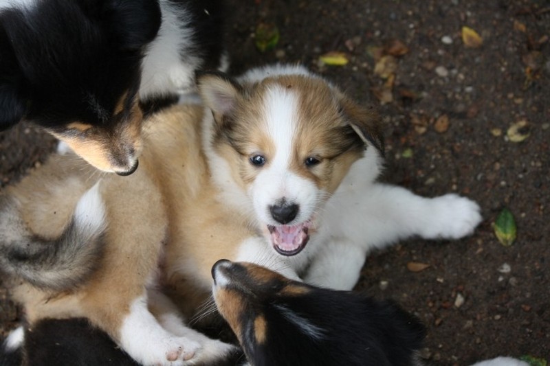 Dann gab es ein tolles neues Spielie. Eine scheppernde Büchse an einem Band an dem mehrere Welpen gleichzeitig ziehen können. Damit sind sie dann begeistert und wild durch die Gegend getobt. Am Ende hat Xperia (Nr.5) die Büchse zum Solokampf mit aufs Zimmer genommen und dort völlig abgedreht.
