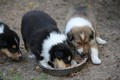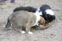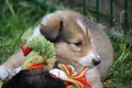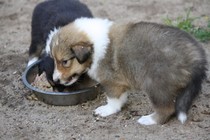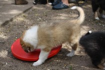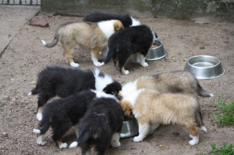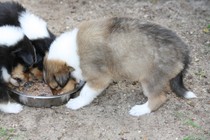 Die Kleinen sind jetzt schon richtige Langnasen geworden. Xenia ist letzte Woche bereits als erste in ihr neues Zuhause umgezogen. Das war für Urte wohl frustrierend und so war ich auch nicht allzu verwundert das Urte diesmal bei meinem Anblick etwas nervös und mir gegenüber recht abweisend wirkte, obwohl wir uns die letzten Wochen doch ganz gut kennen gelernt hatten. Urte wurde dann erst mal in den Zwinger nebenan gesperrt und die Welpen haben Trockenfutter bekommen, das sie sich sonst sowieso von Mutter wegfressen lassen hätten. Sie haben immer mal einzelne Stücke vom Napf verschleppt um sie dann zu kauen und sich dann wieder einen Haps zu holen, zu kontrollieren ob ein Geschwister was Besseres gefunden hat oder zwischendurch eine Runde zu spielen. Gierig ist anders ;-)