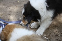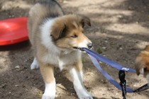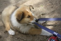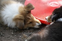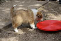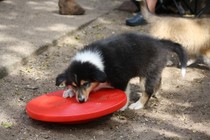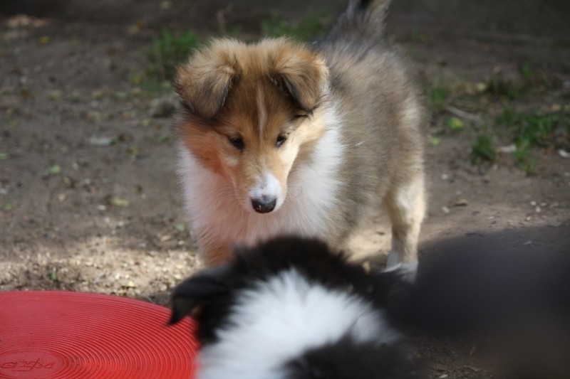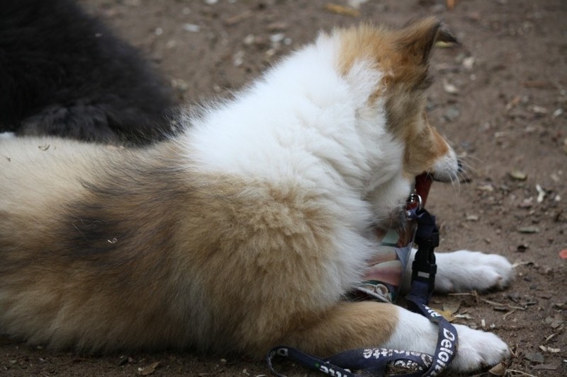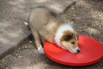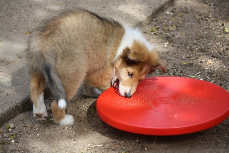 Diesmal hatte ich ein neues Spielzeug mitgebracht, das ich auf so mancher Homepage bei Welpen gesehen hatte. Auch wenn nicht dazu gedacht war es klar das die Scheibe erst mal mit den Zähnen getestet wurde. Aber auch Aufsteigversuche mit zur Seite kippen wurden unternommen und Rutschpartien und drüber weg geschleudert werden im Sozialspiel :-)