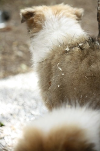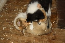 Während einem Regenschauer wurde draußen Trockenfutter gefressen oder im Zimmer gespielt (und sich dabei mit Sägemehl eingesaut)