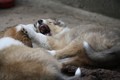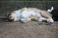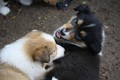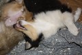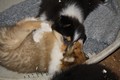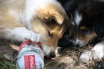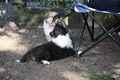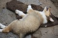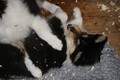Ronja auf Dosenjagd, kriegt den Mund nicht voll genug. Die Dose muß auch zum Schlafen mit ins Sandloch, Ronja mit Xanthos als Kopfkissen.