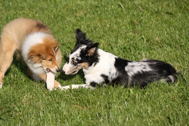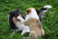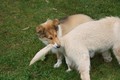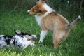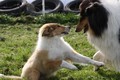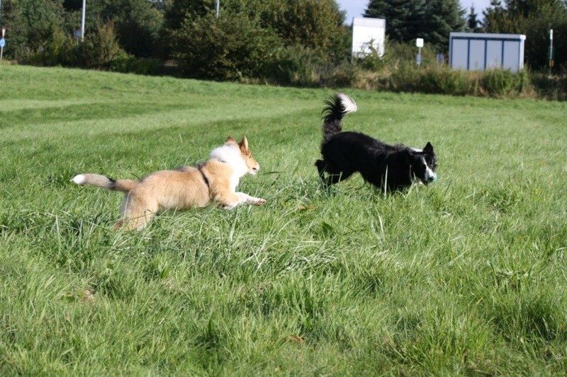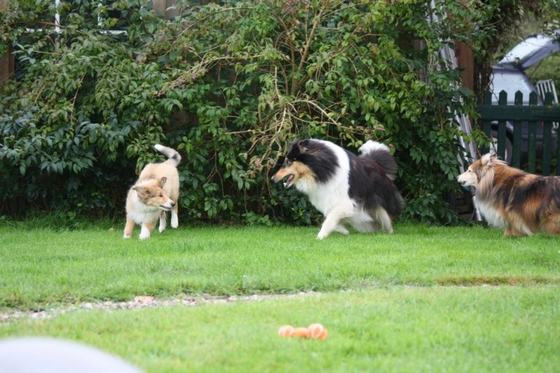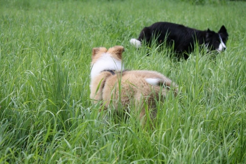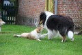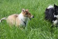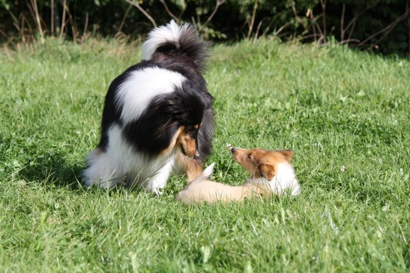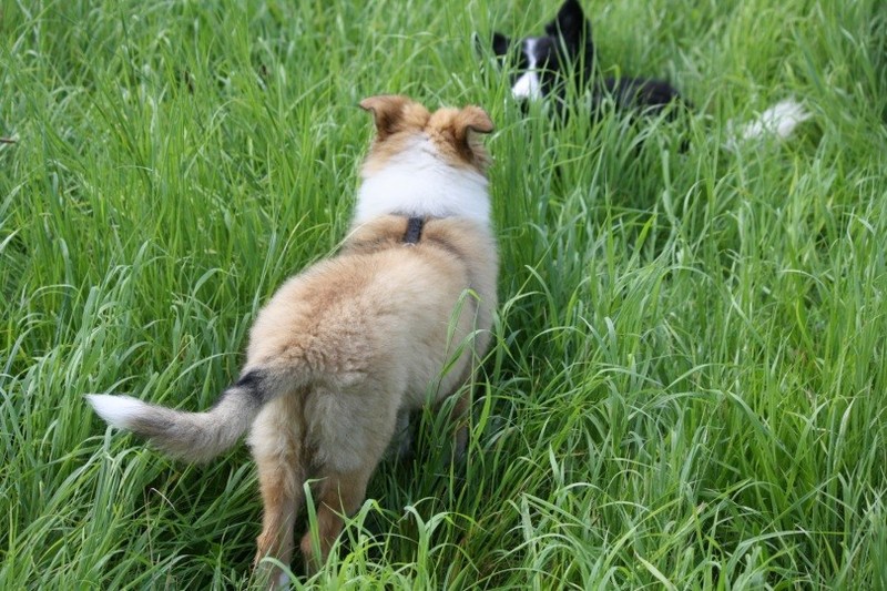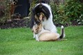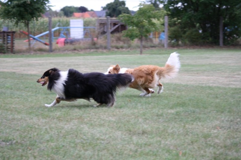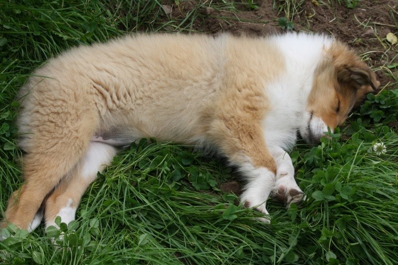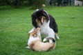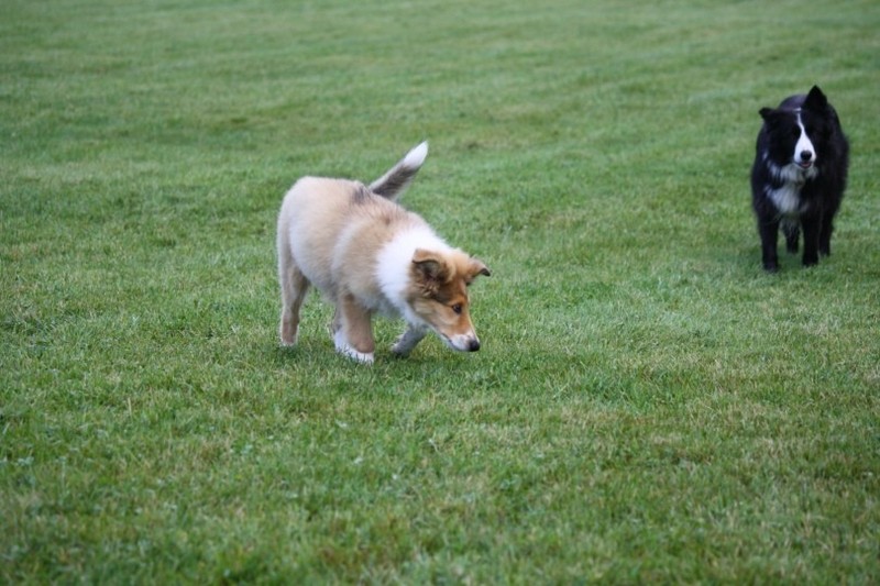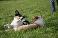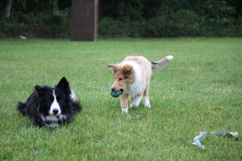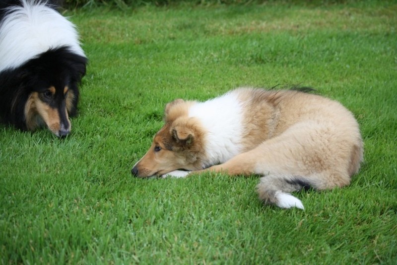 Nach einem wilden Spiel ist der kleine Collie auf der Wiese umgeplumpst und an Ort und Stelle eingeschlafen. Für eine ganz schön lange Zeit. Als Ronja wieder auf den Füßen war mußte Susan schon fast los und es gab nur noch ein kurzes Spielchen mit Ivy und sehr flüchtiges Kennenlernen von Sheltie Luca.