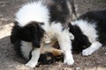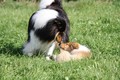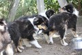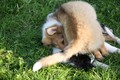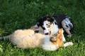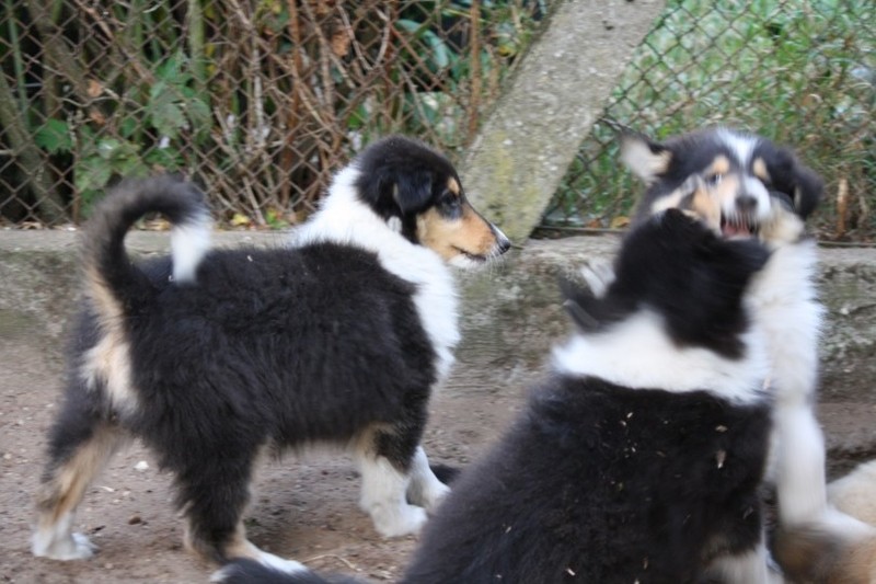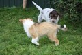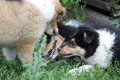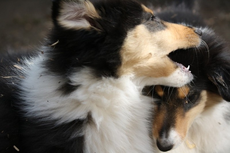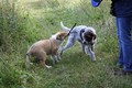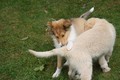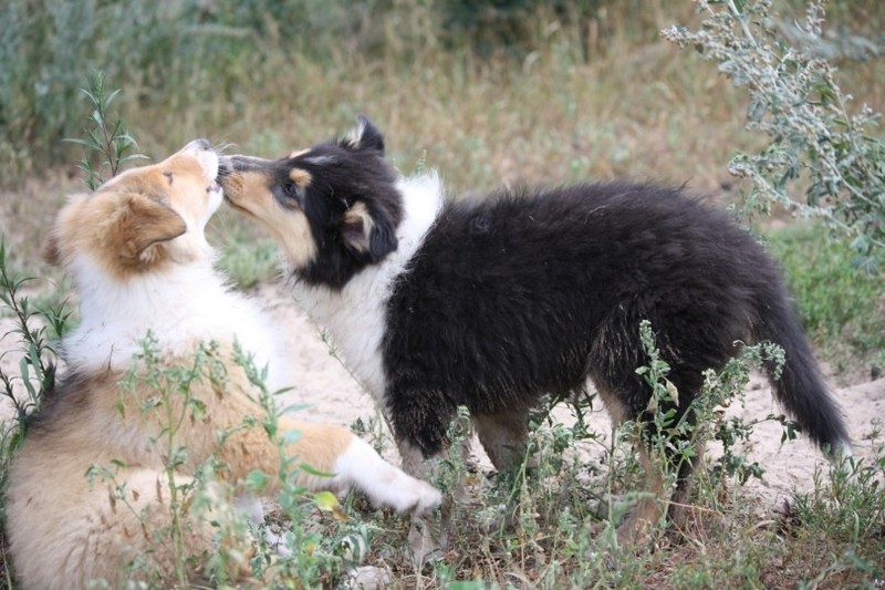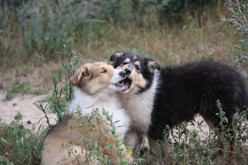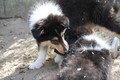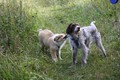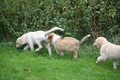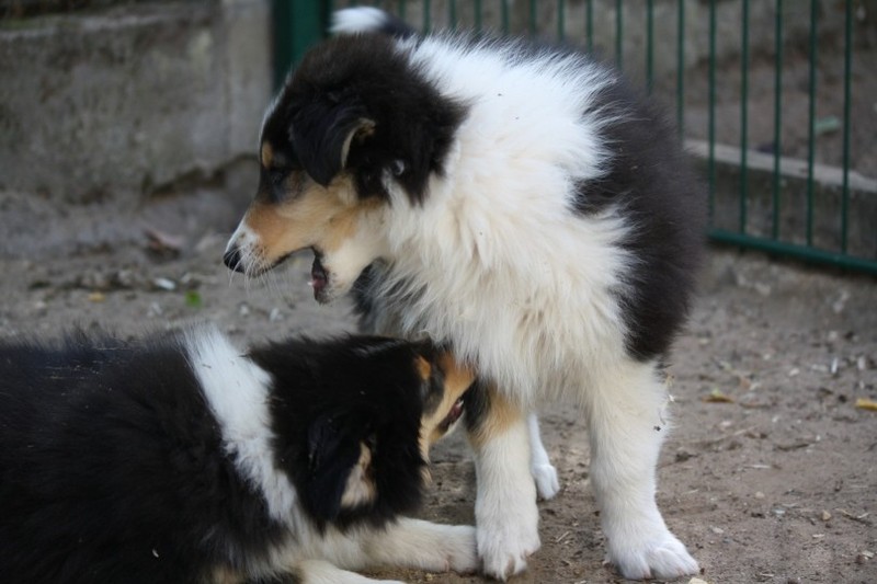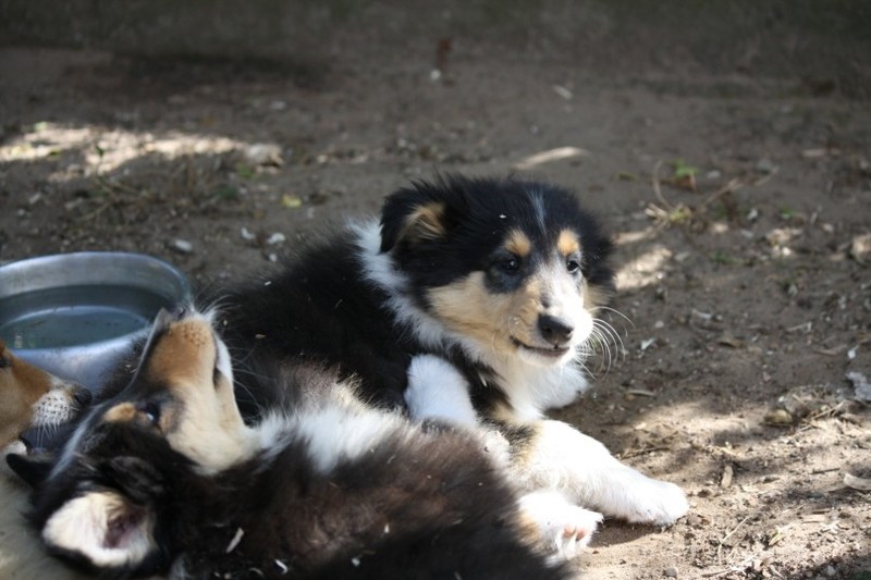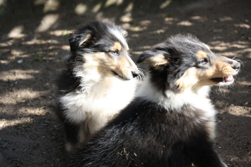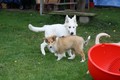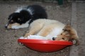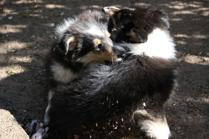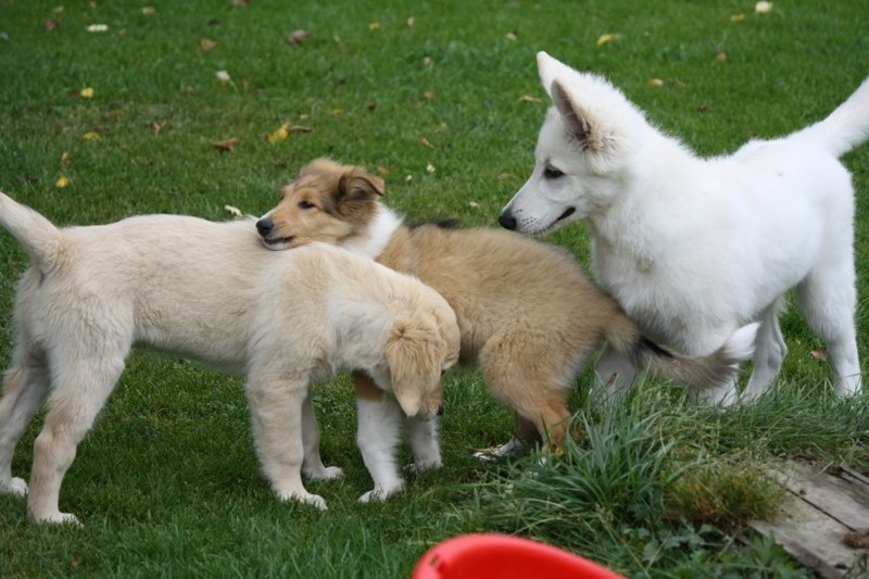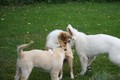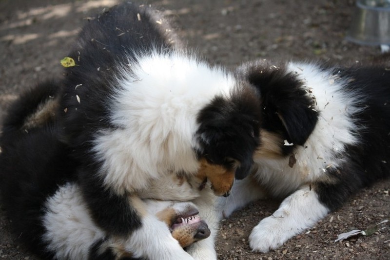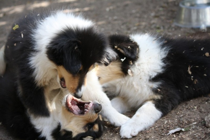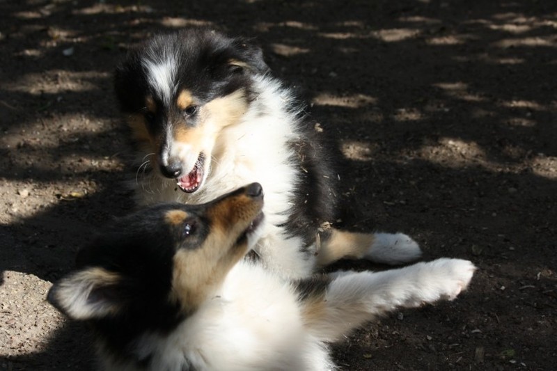 Zuerst nur Ronja und Lainie (Cream 'n' Sugar of the biscuitbox). Ronja ist immerzu umgekullert, hat sich hingeschmissen sobald Laine sie nur angeschaut hat. Nach einer Weile kam die 1 1/2 jährige Ivy (Fiasco Faye of the biscuitbox) dazu. Ronja erst mal gaaaanz klein und devot. Aber dann kam es doch zum Spiel und erstaunlich wie schnell Ivy sich nach ersten zu wilden Welpe- wieder-platt-Mißerfolgen vorsichtig zurückgenommen hat. Und Ronja wurde dann auch frecher. Zwischendurch ist sie dann auch immer mehr mit Laine herumgelaufen ohne umzuplumpsen. Als dann die durstigen Hunde eine Schale Wasser bekommen haben hat Ronja nach ein paar Schluck den Napf ausgekippt und stolz herumgetragen. Ordentlich damit angegeben und versucht Ivy damit zum Abjagen zu animieren aber Ivy verstand nicht so recht was der Blödsinn den Napf auszukippen sollte ;-)