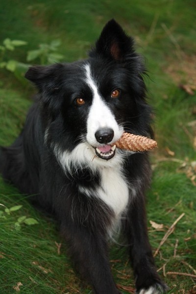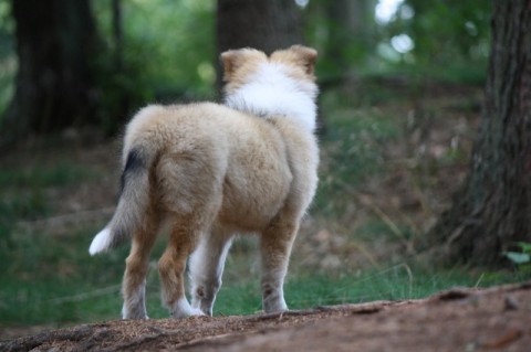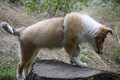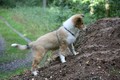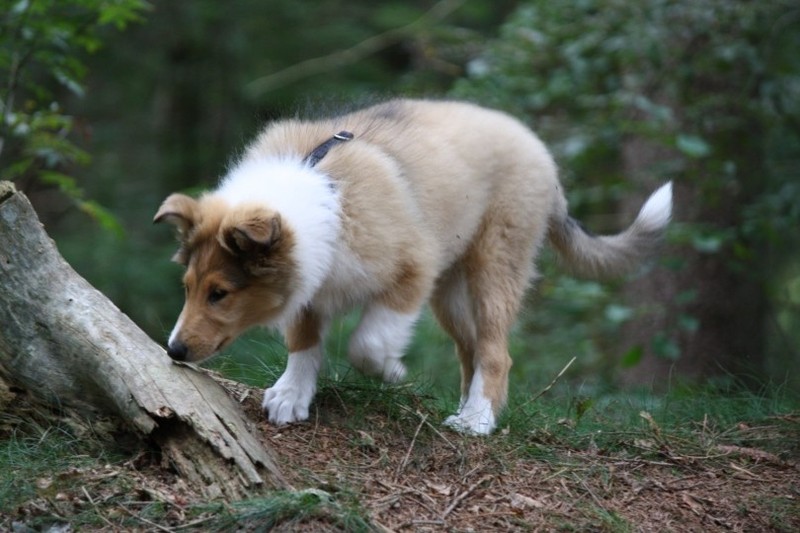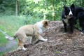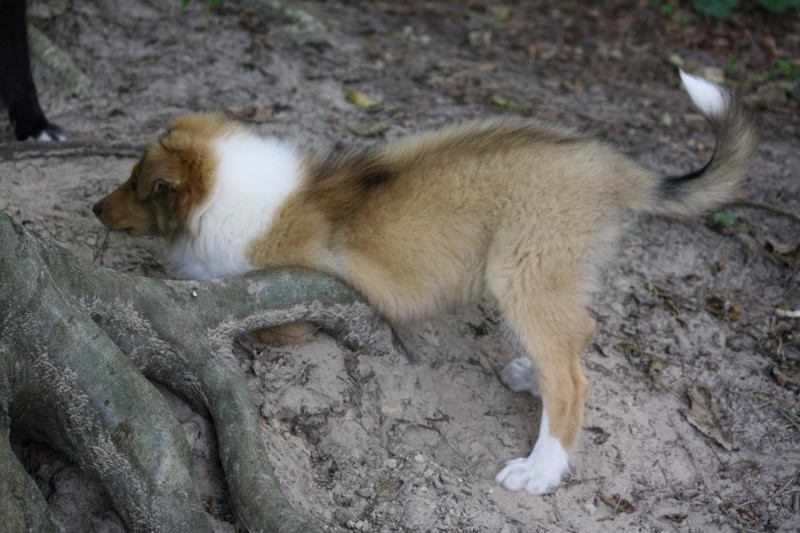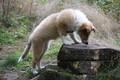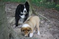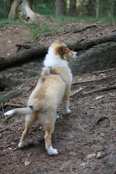 Morgens gab es ein Clickerfrühstück mit dem Elefantentrick und auf der Vormittagsrunde gab es dann auch Click und Leckerlie für Vorderfüße auf dem Baumstumpf - Generalisieren des Elefantentricks oder Ausbildung zur Ziege;-) Naja, zum Fotografieren mußte man noch etwas mit Leckerlie drauf legen manipulieren um schnell genug in Fotoposition zu kommen. Annouk, der souveräne (*hüstel*) Althund zeigt wie es geht. Außerdem war dann auf Entdeckungstour gehen und ausgiebiges Spielen im Wald dran. Hinter Annouk herflitzen, intensives Spiel mit einem Spielie mit mir und z.T. Annouk, Zapfen kauen, Botanik kauend pausieren während Annouk den "richtigen" (nach mir und dann nach dem 1. Mal auch nach Annouk riechenden - tja, sie ist in Obi-Rente) Zapfen sucht und bringt, zwischendurch im Sand kullern und fast einschlafen aber dann war doch wieder was zu spannend.
