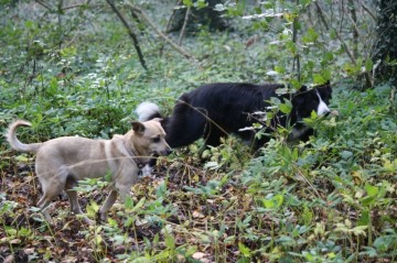 Dann sind wir zu Babette gefahren. Stine hat nachgegeben und zum ersten mal in der Wohnung mit Ronja gespielt. So süüüüüüß!!! Gemütlich Cappucino trinken und den Hundis beim Spielen zuschauen, das hat auch mal was! Katha kam dann auch noch und wir sind mit den Großen eine Runde im Wald spaziert während Ronja in der Wohnung im Kennel geschlafen hat. Anschließend durfte Ronja in den Garten raus und war wieder munter für weiteres Spielen mit Stine. Mangels Gartenzaun mit Stine an der Leine, aber das ging auch.