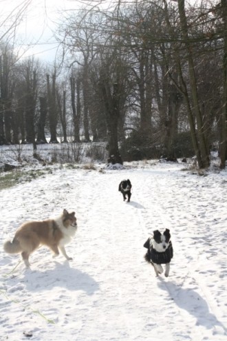 Anschließend waren wir nach kurzer Einzelrunde mit Annouk, Aufwärmen im fahrenden Auto und Nahrungsbeschaffung bei McDonalds mit Katha und Hundis spazieren und sind hinterher noch zu Babette gefahren. Ronja hat ihre Ruhepause immer mal mit einem kurzen Spielchen mit Stine unterbrochen und vor Einbruch der Dunkelheit waren wir auch nochmal eine Runde im Wald. Die Heimfahrt war furchtbar, Schneegestöbere - und das nur um am nächsten Tag zu tauen.