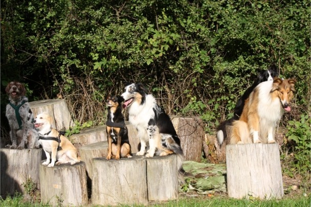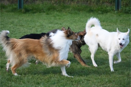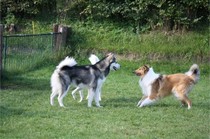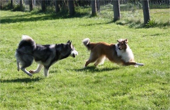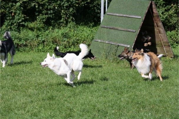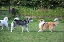 Fotos: Spielen auf dem Hundeplatz. Ronja mit Husky Mix Laika, Alaskan Malamute Junghund Chayenne und weiteren Junghunden.