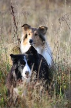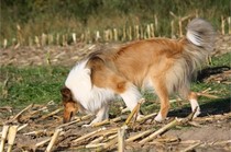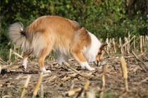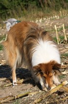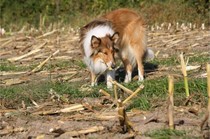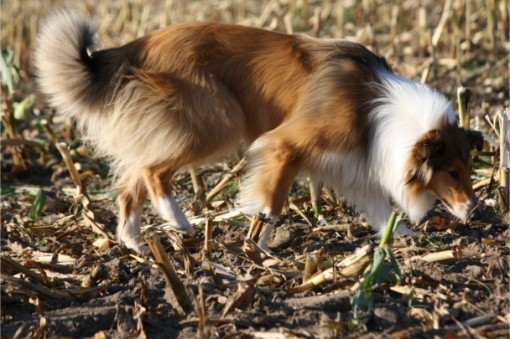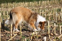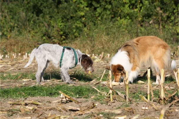 Am Morgen kam eine sms von Babette das die Maisfelder bei ihr hinterm Haus nun frei zum Fährten sind. Juhu, die Maisfeld Fährtentrainingssaison konnte beginnen! Am nachmittag waren wir dann beim gemeinsamen Spaziergang auf dem Weg zum Wald schon erst mal lange auf dem Maisfeld zur Maisnachernte, zum Maiskolben apportieren - für Stine die perfekten Futterdummys ;-) - und zum Fotos machen. Nach dem Spaziergang hatte ich dann für Ronja eine Fährte gelegt, die nach einer Kaffeepause fleißig abgesucht wurde.
