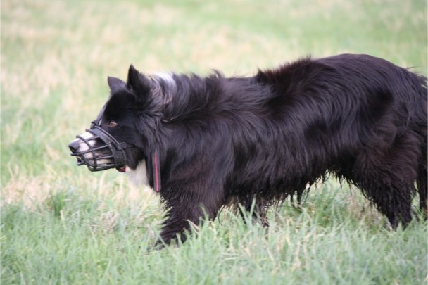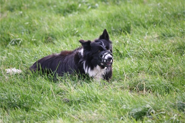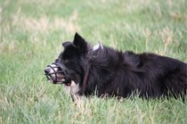 Mitte Oktober hatten wir in der Mittagspause einmal einen mir bisher unbekannten kurzbeinigen Hund getroffen, der Annouks Warnungen nicht sehr ernst genommen aber erst recht ruhig daherlaufend auch nicht mit Ronja gespielt hat. Weil noch eine die wir öfters treffen mit ihrer Hündin dabei war und ich Lust zum Schnacken hatte bin ich da mit und nicht alleine in eine andere Richtung gegangen. Zwischen enger stehenden Bäumen bekam die Kurzbeinige dann einen Rennanfall und rannte so dicht an der Annouk, die dieses Gerenne haßt, vorbei, das Annouk beim Schnappen ohne einen Schritt vorwärts zu gehen nicht wie eigentlich üblich die Luft getroffen sondern eine Bißverletzung unterm Auge verursacht hat. Bei mir hatte Annouk damit erst mal großen Frust, das es nun nach 9 Jahren ohne fremde Hunde beim um sich schnappen zu verletzen das zweite Mal innerhalb einiger Monate nicht mehr nur die Luft und von daher nicht mehr "sicher" war, verursacht (und diesmal gab es auch eine Tierarztrechnung). Bis zum Aufsetzen lassen und Tragen hatte ich Annouk vor Ronjas Ankunft bereits an den Maulkorb gewöhnt gehabt aber so ein Maulkorb behindert ja die Füße ungemein und das damit Laufen hatten wir damals noch nicht hingekriegt. Das wurde jetzt dann ohne viel Eidideidi einfach erstmal durch an der Leine mitnehmen möglich gemacht. Nachdem Annouk festgestellt hatte das sie auch mit Maulkorb noch einen aufdringlichen Rüden abstoßen konnte ging es dann doch auch frei laufend. Ende Oktober haben wir in der Mittagspause dann auf der Eiderwiese Sandra und Birte mit ihren Hunden getroffen und beim Mitrennen und Hüten der Hunde mit Bällen hat Annouk den Maulkorb dann ganz vergessen. Bis es ihr beim Zustoßen auf den Ball deutlich wurde das man damit keine Bälle aufnehmen kann ;-). Annouk muß den Maulkorb jetzt nicht immer tragen, aber es ist gut das sie nun auch damit laufen und ich ihn im Zweifelsfall lieber aufziehen kann. Zur Übung gab es ihn Ende Oktober, Anfang November aber erst mal jede Mittagspause unabhängig von Hundebegegnungen auf.