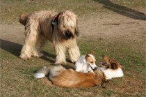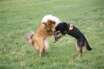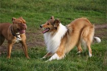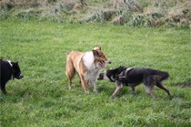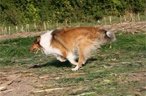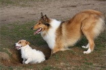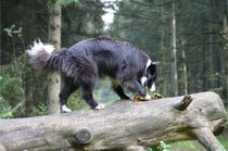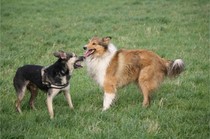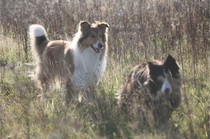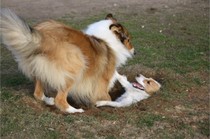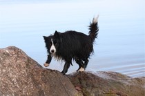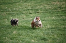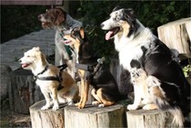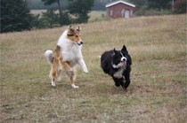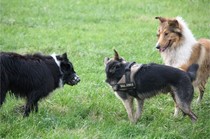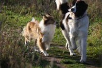 Am Nachmittag waren wir dann mit Stine, Cooper, Holly, Pico und ihren Frauchens spazieren und Annette hatte auch noch einen Pensionshund mit. Ronja und Cooper haben ausgiebigst gespielt und zwischendurch war auch Holly im Spiel dabei. An einem Gewässer hat Ronja sich dann so weit vom Mäuerchen vornübergebeugt das sie einen Köpfer ins Wasser gemacht hat und ich sie da raus fischen mußte. Und weil die Ronja nicht so gerne patschnaß ist hat sie sich noch schön an meiner Hose trocken gerubbelt ;-)