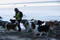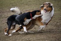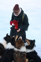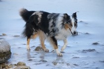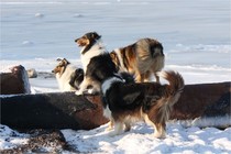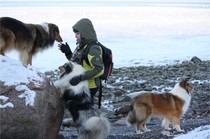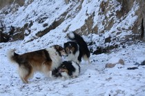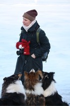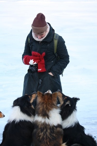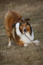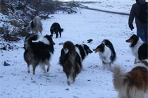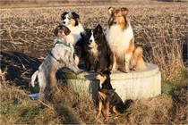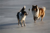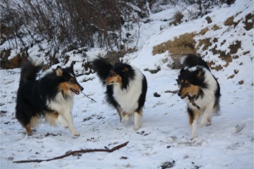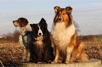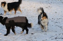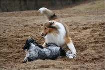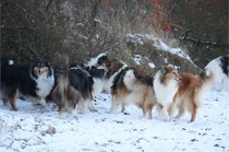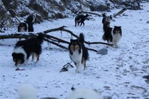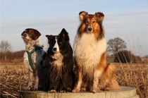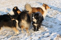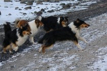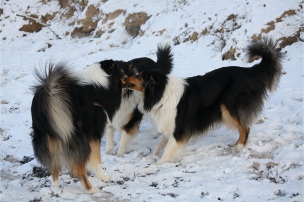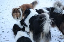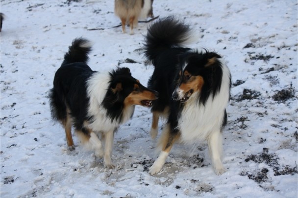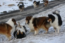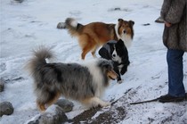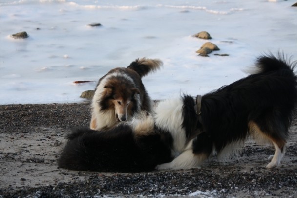 Ronja hat diesmal irgendwie nicht recht den Anschluß ans wilde Spiel der Geschwister gekriegt, während Mutter Urte richtig gut drauf war und da auch ordentlich hingelangt hat ;-) Wolke war irgendwie auf einem ich-will-Streiten Trip. Besonders gerne hätte sie das wohl auch mit Annouk gewollt, aber Annouk hatte auf sowas keine Lust. Sie hat Wolke tapfer ignoriert, und als das gar nicht mehr möglich war, einmal klipp und klar deutlich zu verstehen gegeben, das sie zu sowas keine Lust hat. Nur mit Ronja hatte Wolke ihren vollen Erfolg. Die beiden hatten sich 2 mal in der Wolle. Mit viel Gezeter und Gewirbel wollte keine aufhören, so daß wir die 2 Nattern beidemale getrennt haben. Für Ronja waren das die ersten Prügeleien im Leben. Und nach dem ersten Mal noch richtig im Brass, hat sie auch das erste Mal endlich einen aufdringlichen erwachsenen Rüden heftig abgezickt. Allerdings nicht so heftig, das es gewirkt hätte. Zu meinem Erstaunen konnte Annouk ihn dann bei kurzer Eis-Merci-Picknick Pause rein durch Gewittergrollknurren von Ronjas Leib fernhalten. Auf dem Rückweg nach dem Essen entpuppte der Rüde sich als Stöckchen Junkie und es entstand das Stöckchen-Lauer-Hunde-Dominosteine Bild: Stöcken-belauert von Roché (?) -belauert von Annouk-belauert von Ronja. Stöckchen wird geworfen.... (davon gibt es leider kein Foto) ;-)