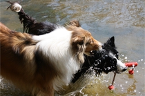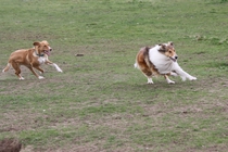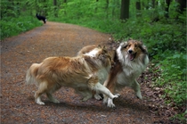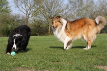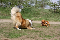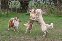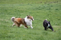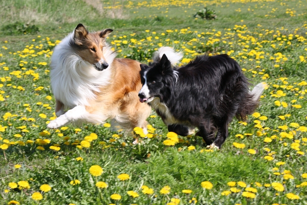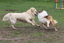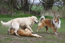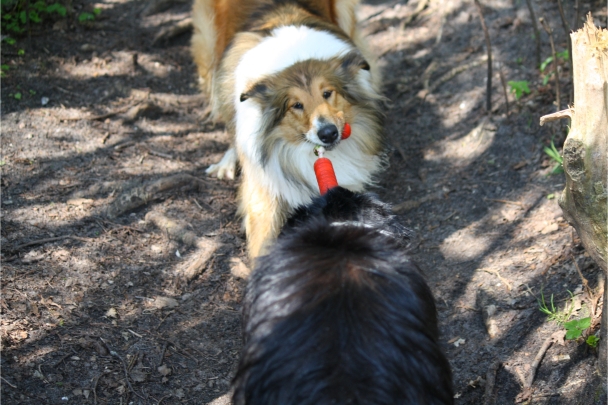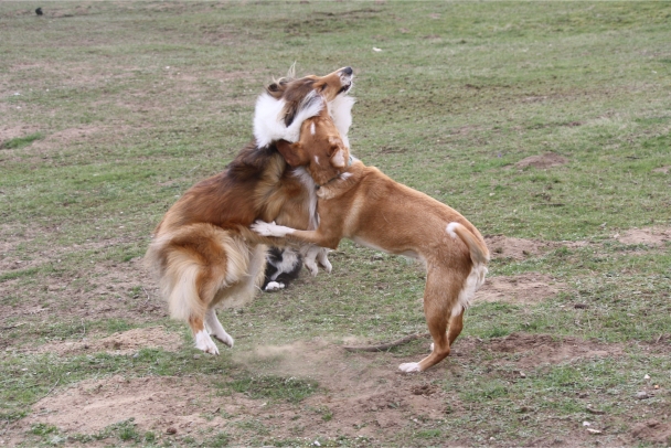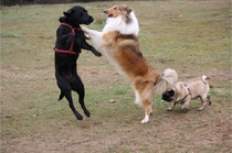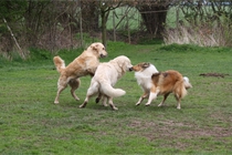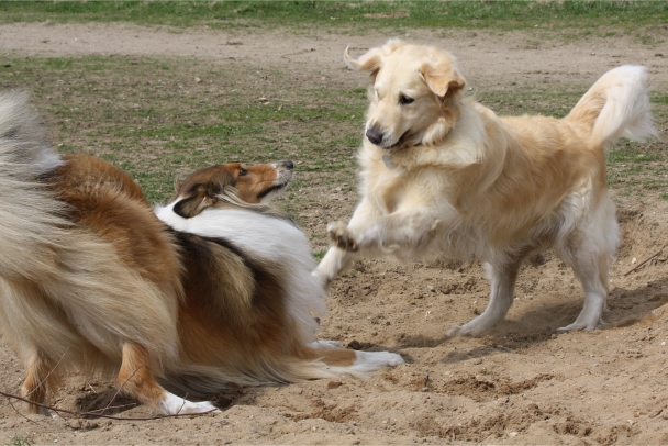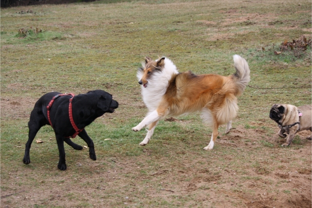 Nachmittags waren wir bei Dani zum Spazieren, gemeinsamen Dogdance Training und anschließendem Hunde toben lassen. Dem Retriever Ringkampf war Ronja nicht gewachsen, und so ging sie gegenüber dem gut trainierten Ringkämpfer Carlos sofort zu Boden. Aber Ronja ließ auch nicht locker, bis Ginger, die mit Ronja in der Junghundegruppe war, nicht mehr nur Augen für ihren Retrieverkumpel hatte, sondern mit Ronja ordentlich über den Platz fegte.
