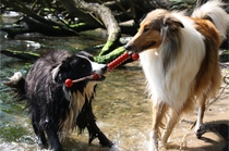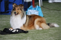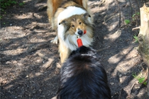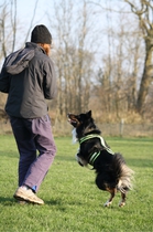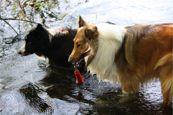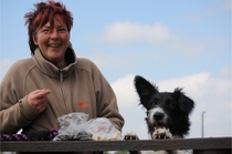 Waldspaziergänge und Spielen mit Gavin und Kimmi am Morgen und späteren Vormittag ließen den Tag schon super beginnen. Dann kamen auch Babette und Annette zum Zuschauen, bzw. erst mal zu einem Mittagspaziergang. Und kurz bevor Ronja nach so viel Vergnügen fast ganz eingeschlafen ist, kam dann unser Funklassenstart dran. Für die Choreo hatte ich mir viel zu kurzfristig zu viel und zu Schweres ausgedacht, aber Fun war ja relativ entspannt zu sehen. Und da konnte Ronja mich dann positiv überraschen, indem sie mehr zeigen konnte, als ich erwartet hatte :-) Sie war gut motiviert und von der Atmosphäre keinesfalls negativ beeinträchtigt, eher im Gegenteil. Ich war begeistert! Einzig und alleine: ich schleppe NIE wieder einen echten Stein als Requisite mit mir herum ;-)