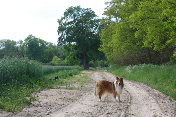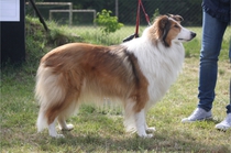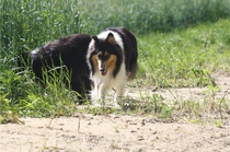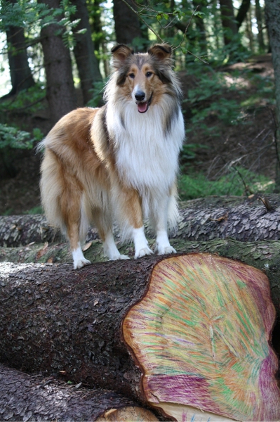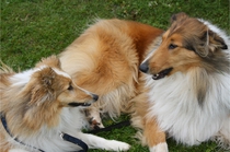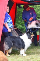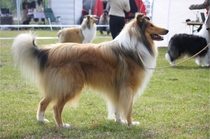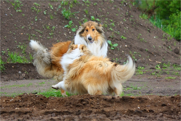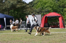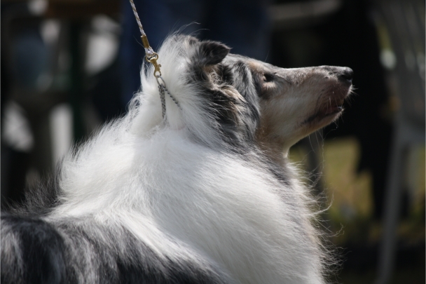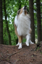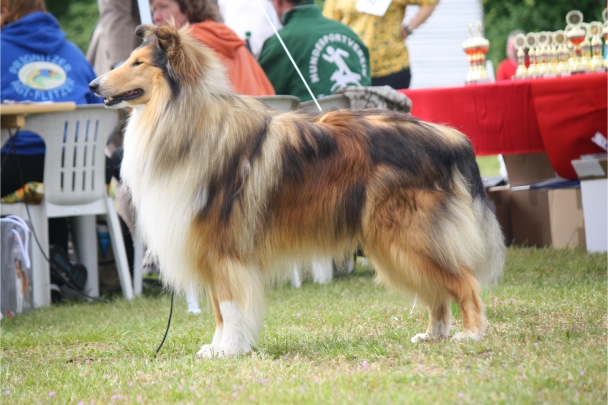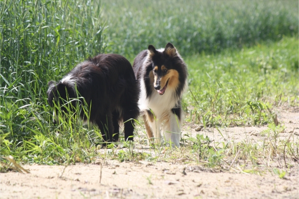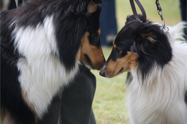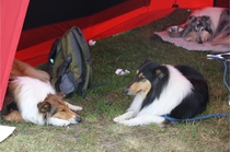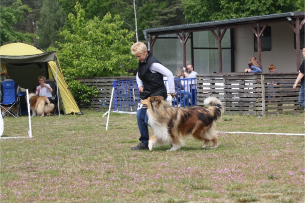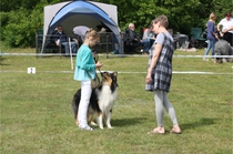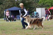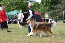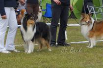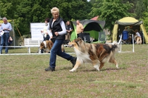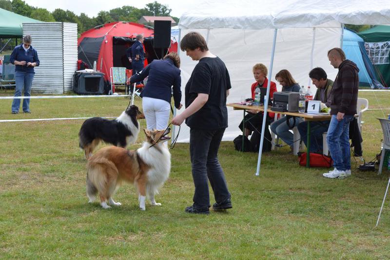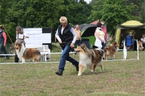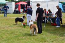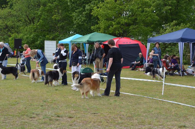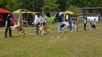 Am Ausstellungstag hatten wir dann viel Zeit, bis wir dran waren. Morgens gab es erstmal einen schönen Waldspaziergang, dann nochmal eine kleine Strecke mit Sabine und Wolke zusammen, wobei wir Piri mitgenommen haben, und auch ein erstes Treffen mit Schwesterchen Xenia und ihrem Frauchen hatten. Anschließend wurden meine Hunde an einem schattigen Plätzchen angebunden und ich konnte mit Fotoapparat bewaffnet noch in Ruhe Rüden gucken. Besonders angetan hatten es mir die Collies vom Sonnenpferd und die beiden Umber Söhne Clyde vom schwarzen Feuer und Ducan vom Hahneflüßchen.