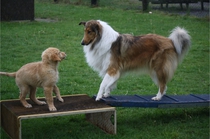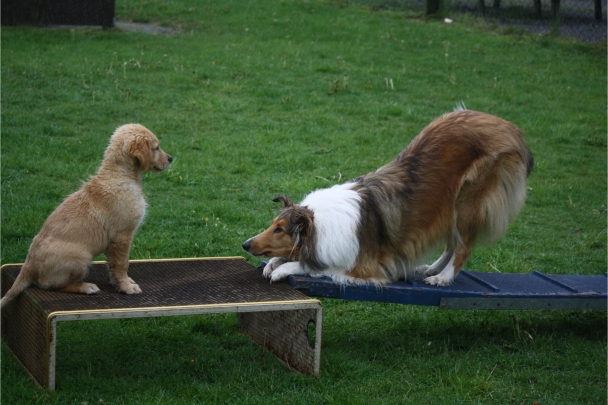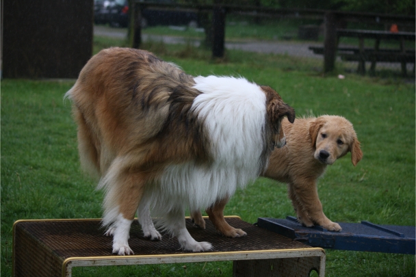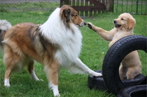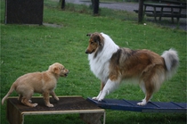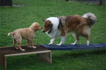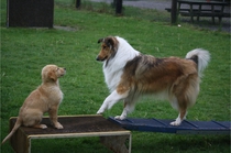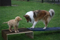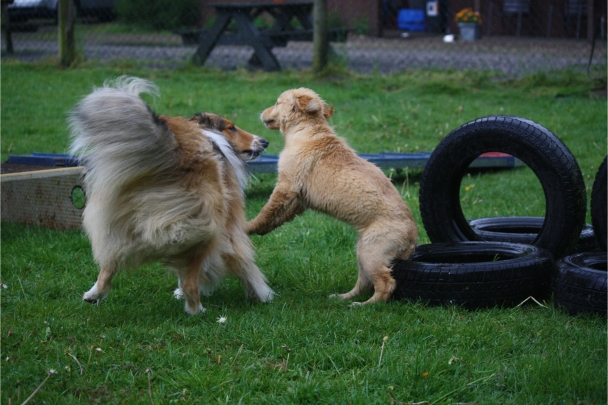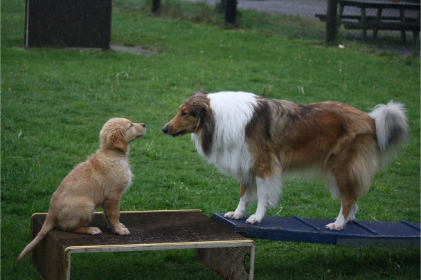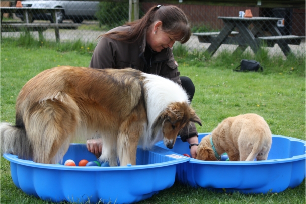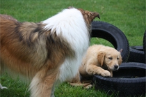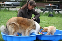 Fotos: Ronja mit dem derzeit einzigen Welpen in der Welpenspielstunde. So richtig zum Spielen ist die Kleine noch nicht aufgetaut, aber schon etwas mehr als letztes Mal