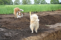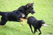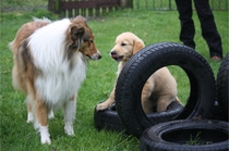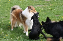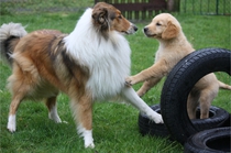 Fotos: 4. Mai, Sonntag vormittag. Ronja mit dem derzeit einzigen Welpen in der Welpenspielstunde und beim anschließenden Toben mit den Junghunden Spike und Nora