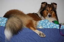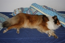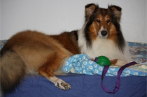 Erstmal Ronja im Bett :-) Mit Ball, und mit Annouk (der alten Hexe) im Blick.