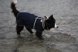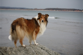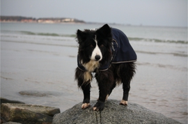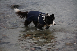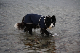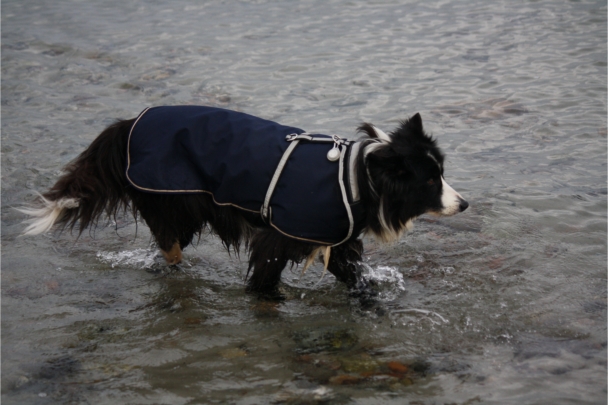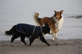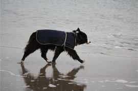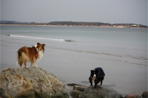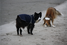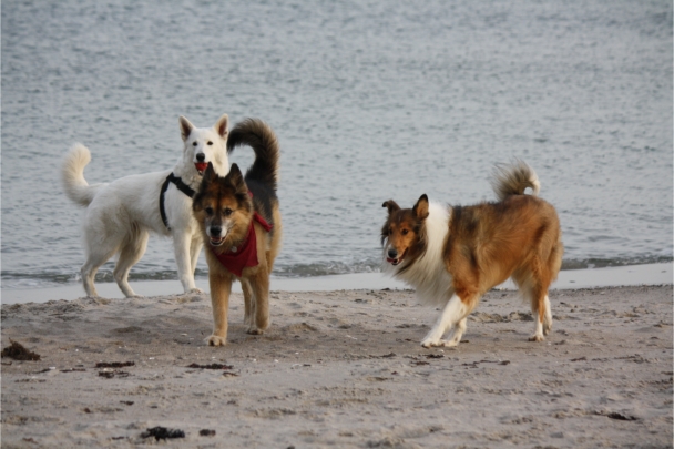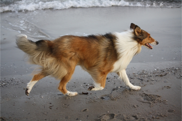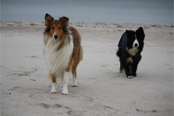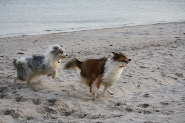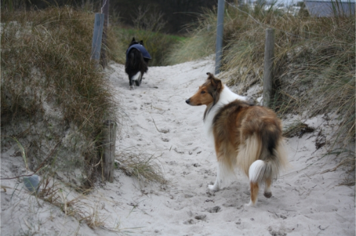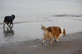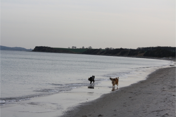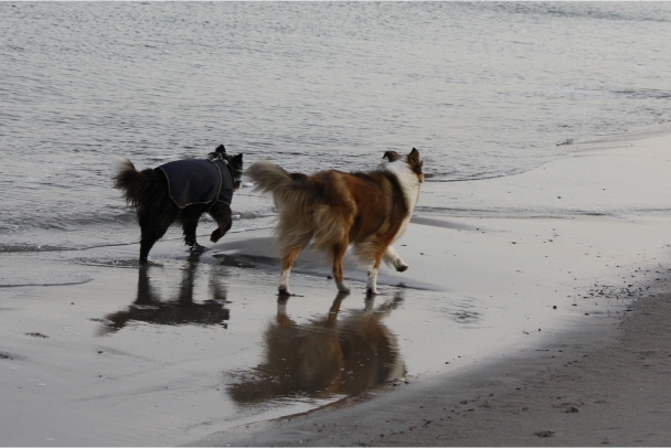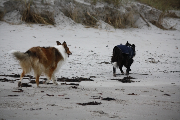 Vormittags hatten wir noch einen tollen Spaziergang am Strand. Die entfernten Knaller wurden von Düne (Lärmschutzwall) und Meeresrauschen gefiltert, so daß Annouk auch entspannt frei laufen konnte. Wir waren für sie dann grenzwertig lange unterwegs. Mit dem Sand und Wasser dazu war Annouk schon fast am Humpeln, aber zum Glück doch nur fast.