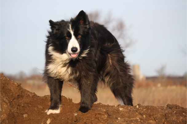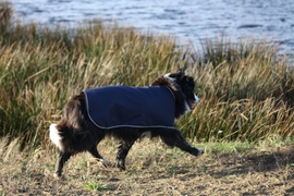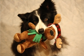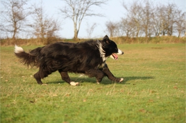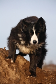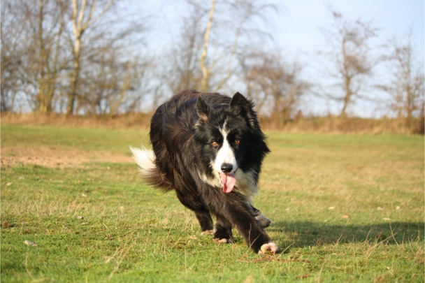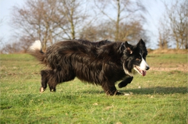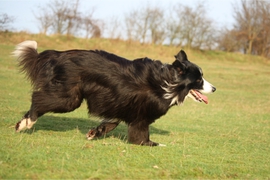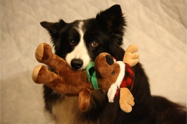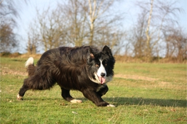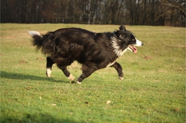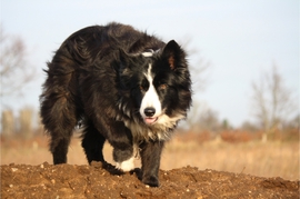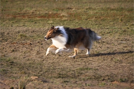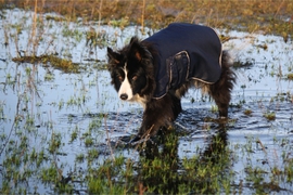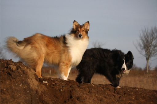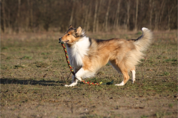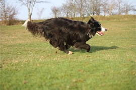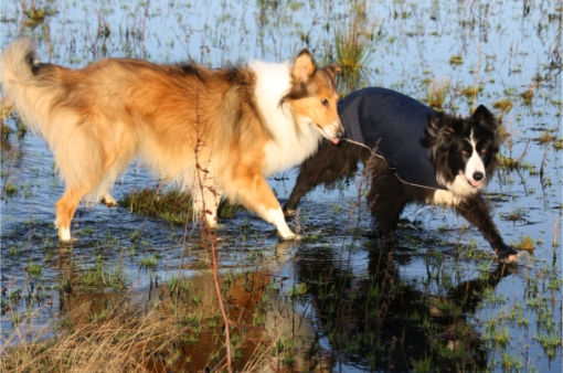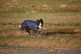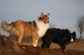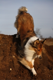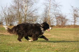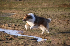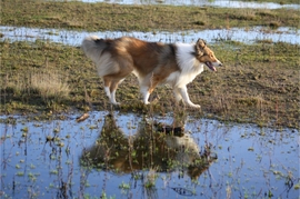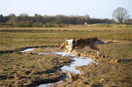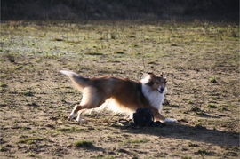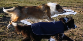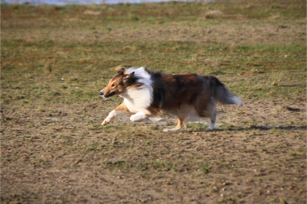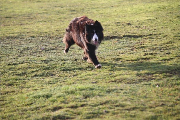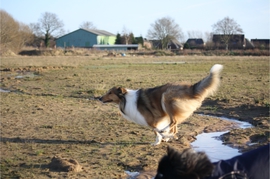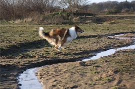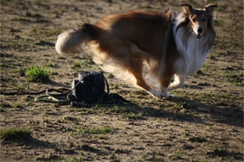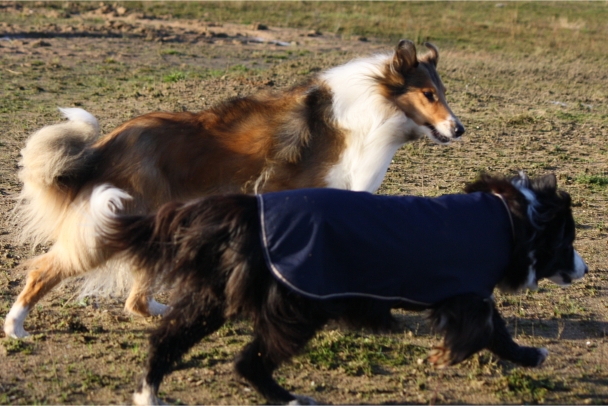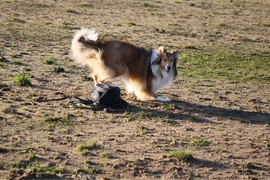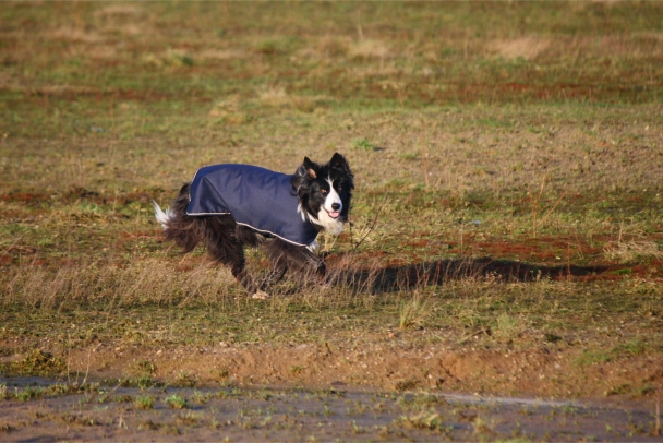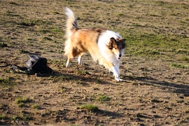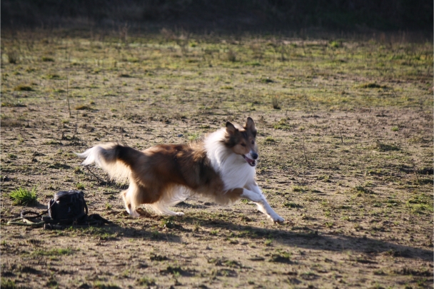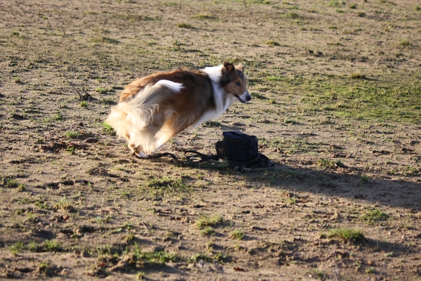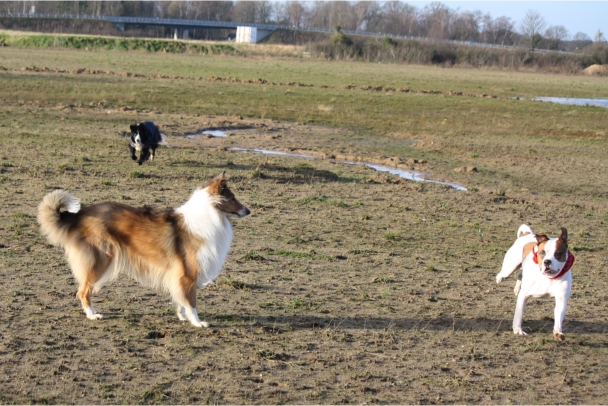 Am 1. Weihnachtstag gab es nochmal Sonne. Für Ronja auch eine Fährte, für Annouk, trotz Weihnachten, auf dieser Fläche keinen Ball mehr. Da sind wir inzwischen einfach zu oft übermütig geworden, so daß ich zur Vorsorge gegen Humpeln keinen Ball in der Tasche hatte. Bei den Versuchen, Ronja beim Sprung über den Wasserlauf zu fotografieren, ist Annouk dann natürlich nicht brav liegen geblieben. Also mit Annouk an der Leine fotografiert. Dann kam noch ein Hund, mit dem Ronja ein bißchen gerannt ist, und ich konnte noch einen fremdanimierten Sprung knipsen. Außerdem die Fototasche erstmals zum Umrunden genutzt. Auf freier Fläche klappte das auf Anhieb deutlich besser, als es derzeit noch mit dem Kegel klappt.