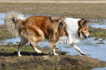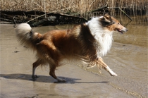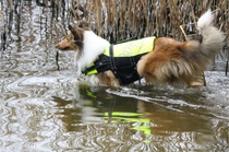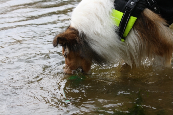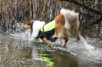 Fotos: 25. April, im Hundefreilaufgebiet und am Wasser. Mit Schwimmweste arbeitet Ronja sich an der Schwimmschwelle vor :-)