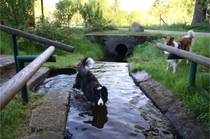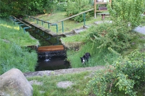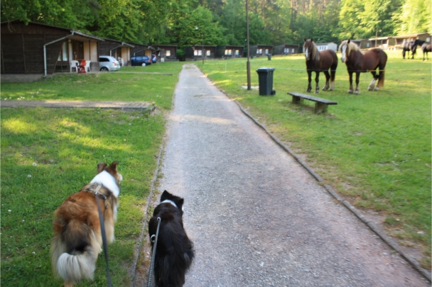 15. Mai: Morgenrunde in Zichtau. Ronja will nicht kneippen ;-) Im Ferienpark waren zu Himmelfahrt auch 4 Pferde angereist und haben vor unseren Bungalows übernachtet. Da konnte Ronja Donnerstag abend noch eine Weile fasziniert Pferde beobachten.