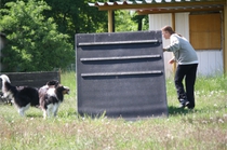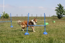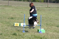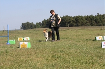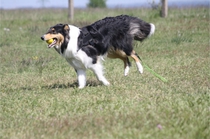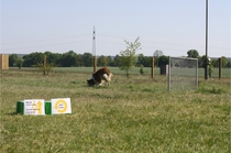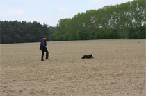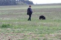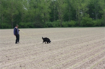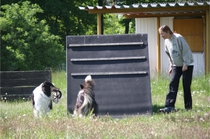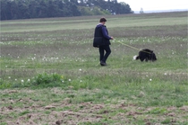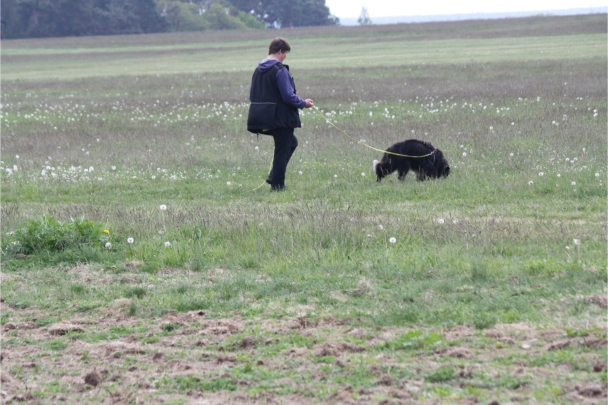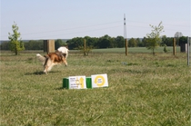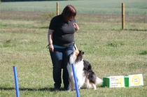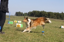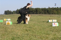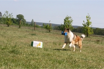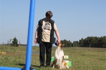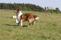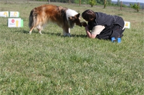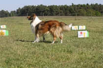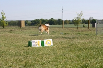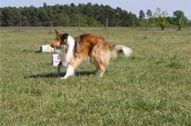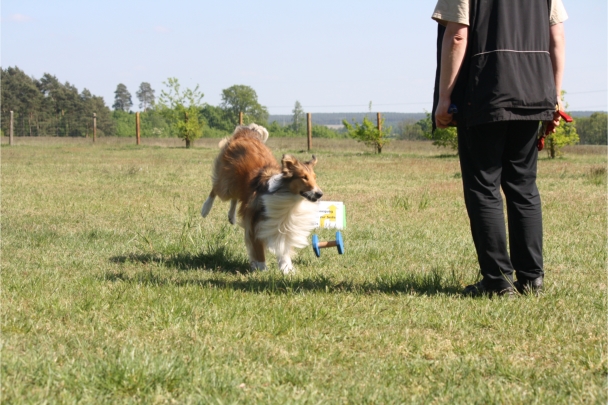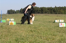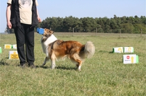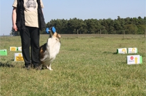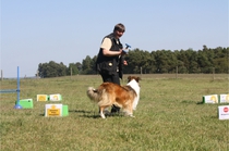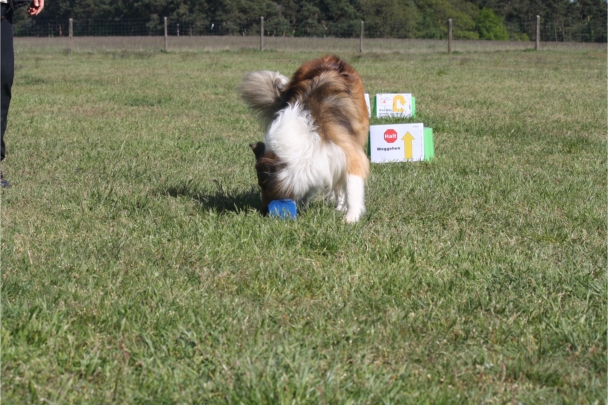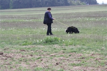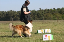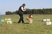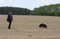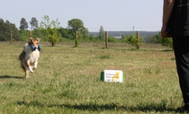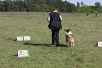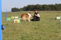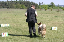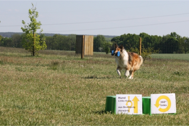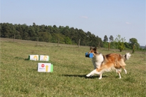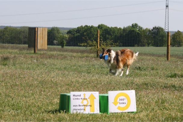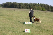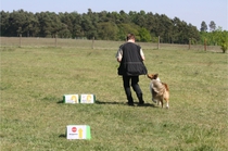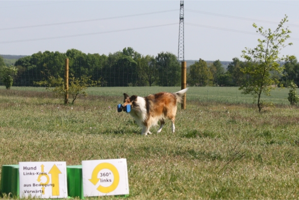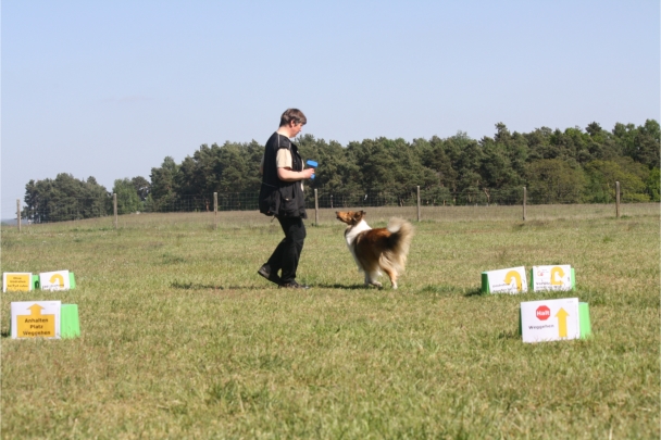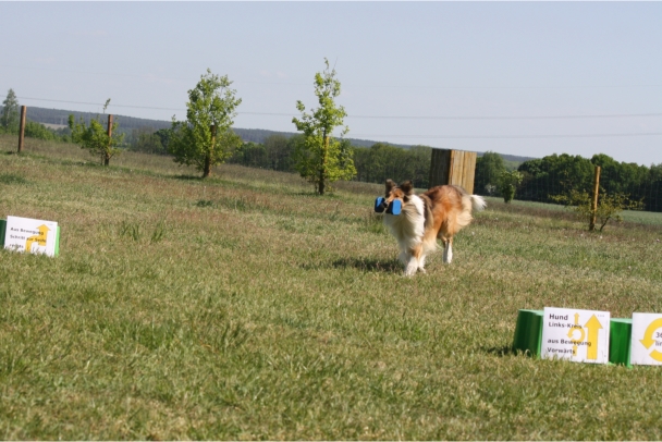 Ronja beim Obedience Training. Erst mal locker zwischen den Schildern gehen, ohne das Ronja die mit der Nase lesen muß. Dann Grundstellung, Apportel halten, Rückwärts gehen, obwohl da Schilder sind (und Leckerlies z.T. fangen), mit Apportel aus kurzer Distanz in Grundstellung kommen und Apportieren Speedtraining auf lange Distanz zwischen Schildern durch. Danke an Conny fürs Fotografieren.