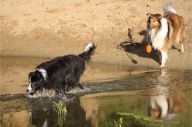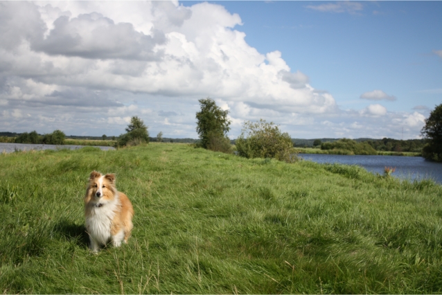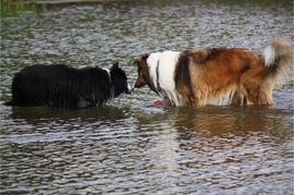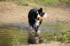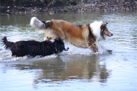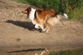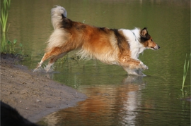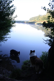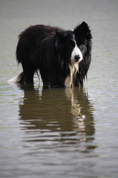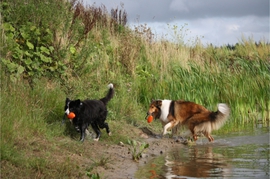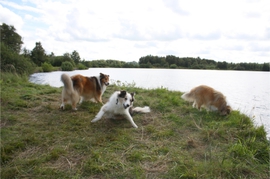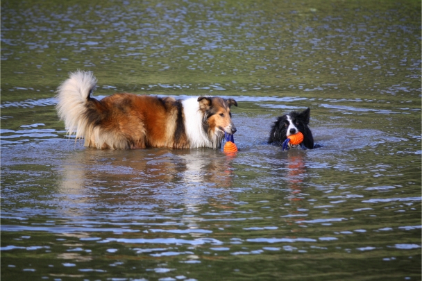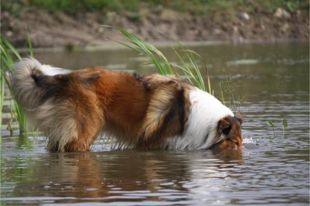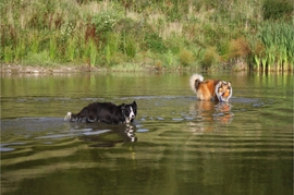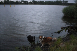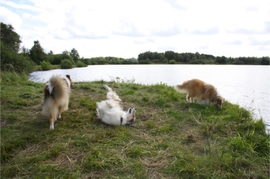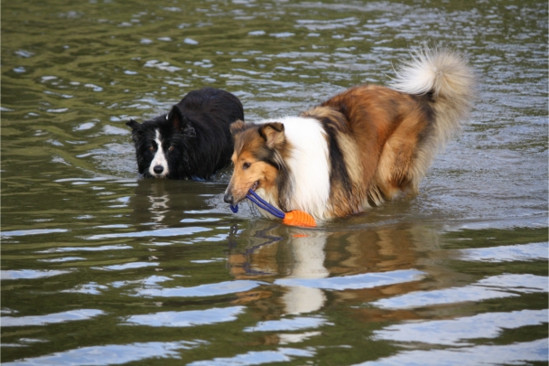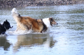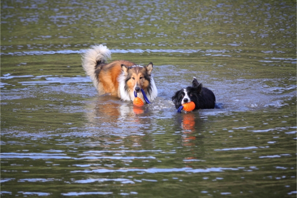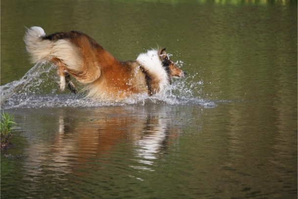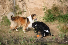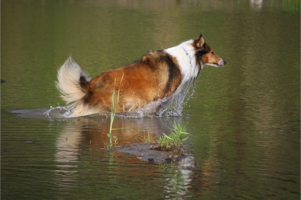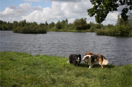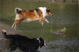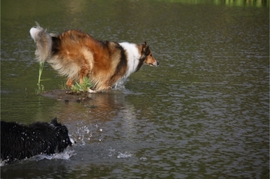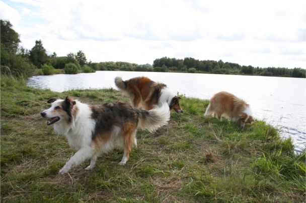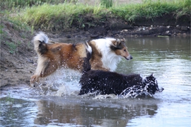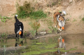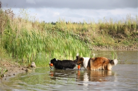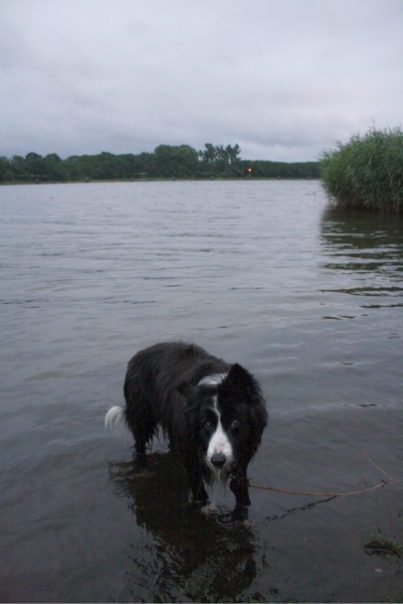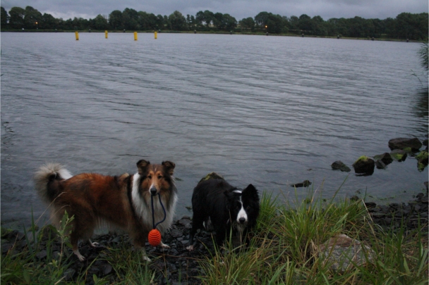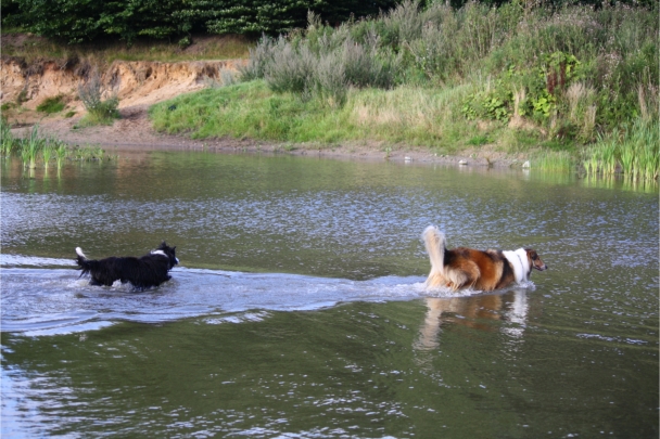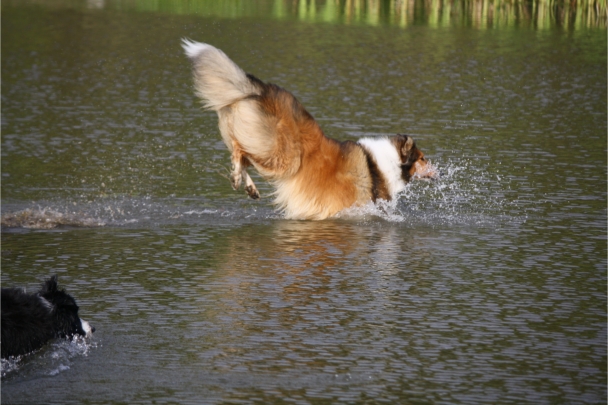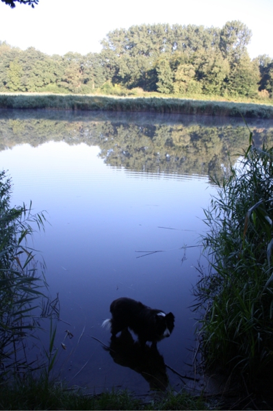 Samstag Nachmittag wurde das Wetter unerwartet schön, und wir haben ein neues Gewässer erkundet. Es war nur so tief, das die Hunde durchgängig laufen konnten, und nicht schwimmen mußten. Dort haben wir ausgiebig, mit Bällen und Fotoapparat den Wasserspaß genossen.