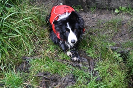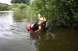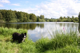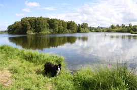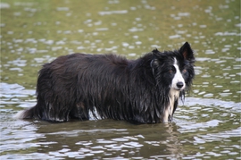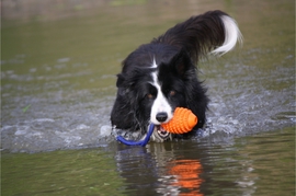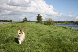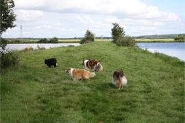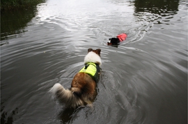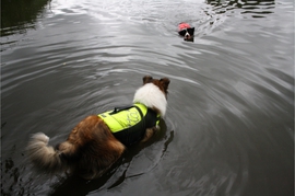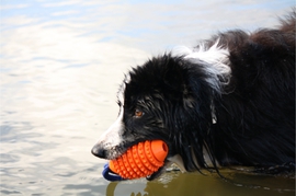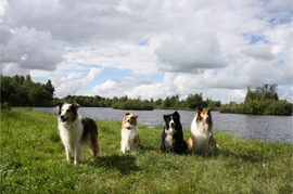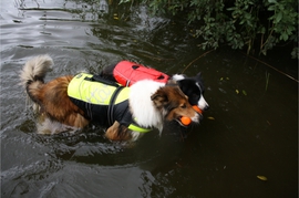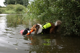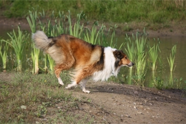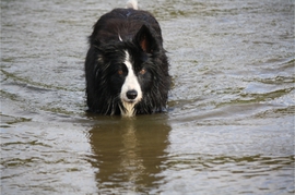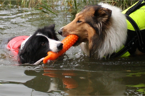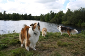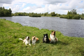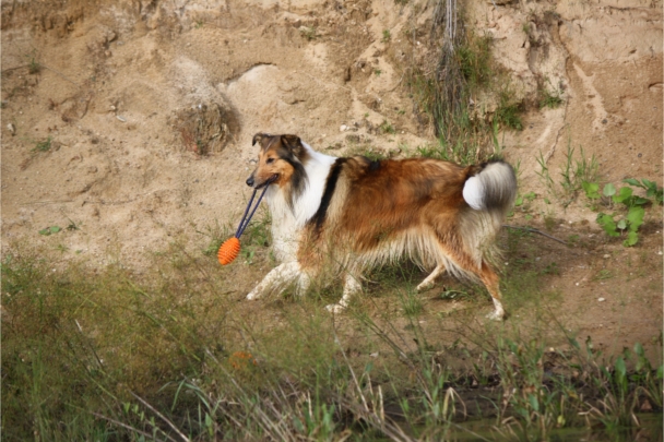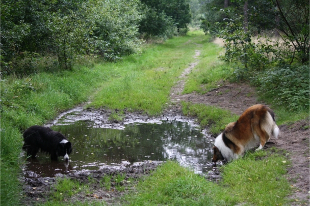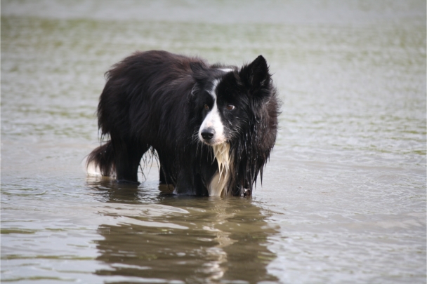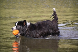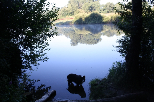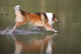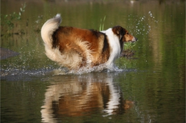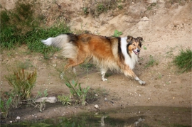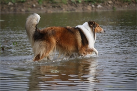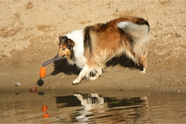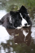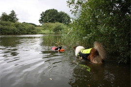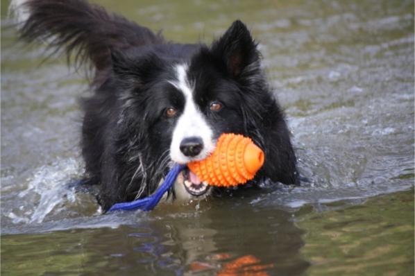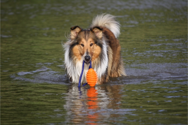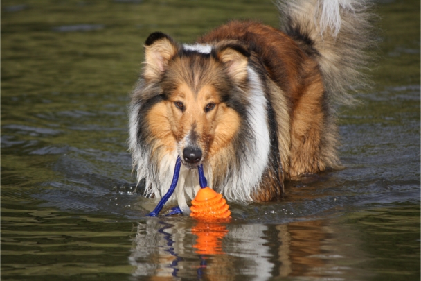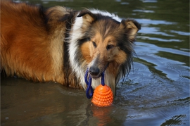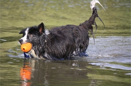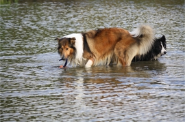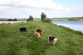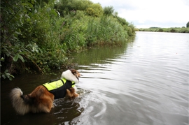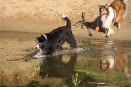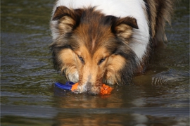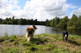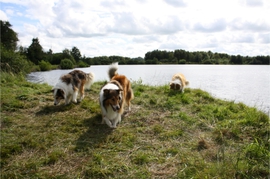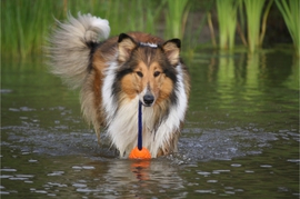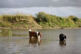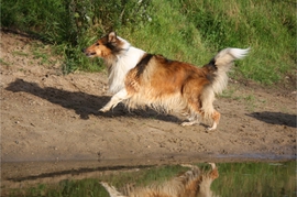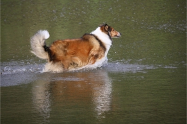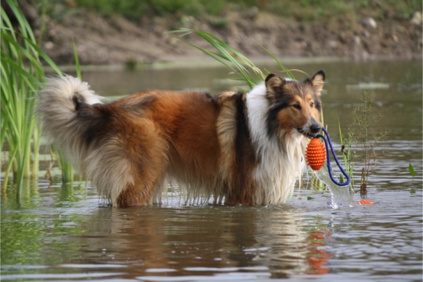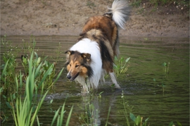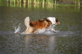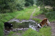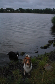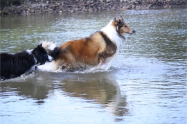 Samstag Nachmittag wurde das Wetter unerwartet schön, und wir haben ein neues Gewässer erkundet. Es war nur so tief, das die Hunde durchgängig laufen konnten, und nicht schwimmen mußten. Dort haben wir ausgiebig, mit Bällen und Fotoapparat den Wasserspaß genossen.