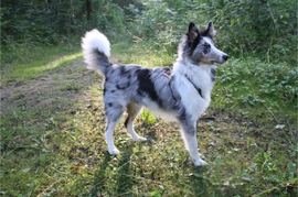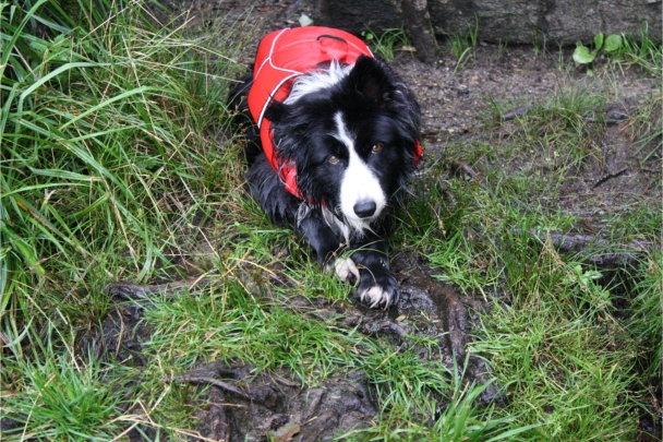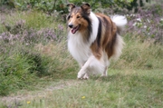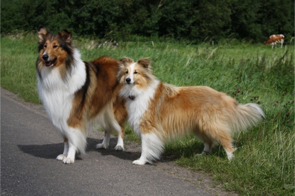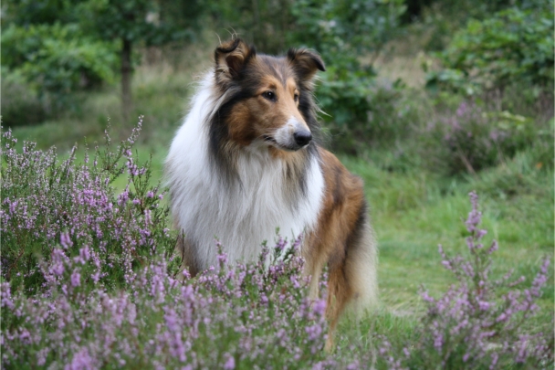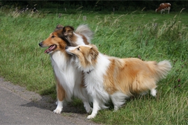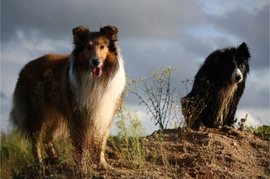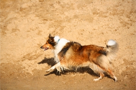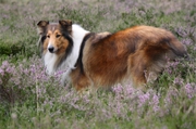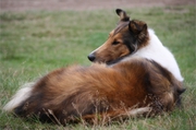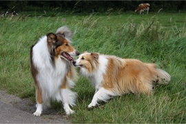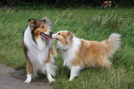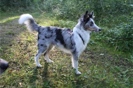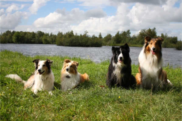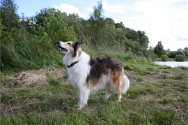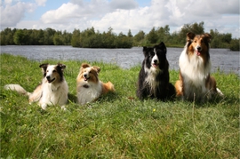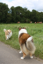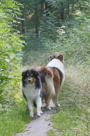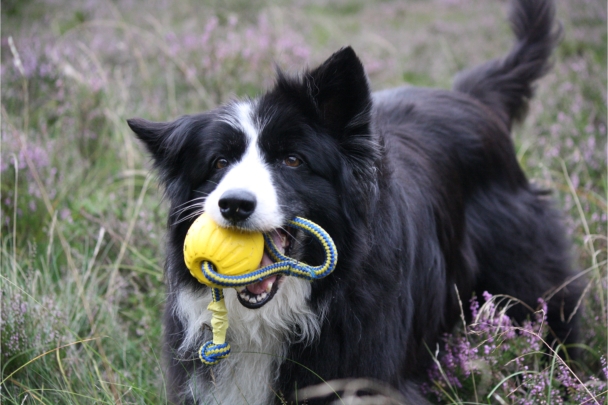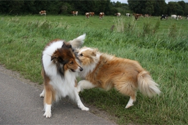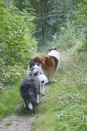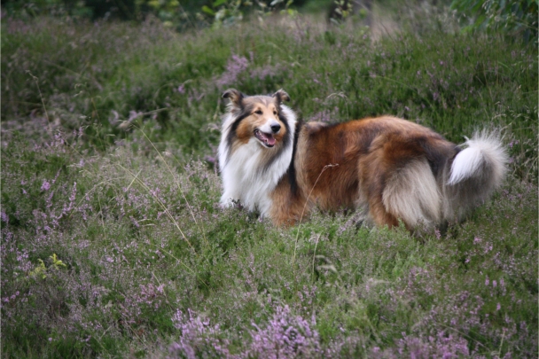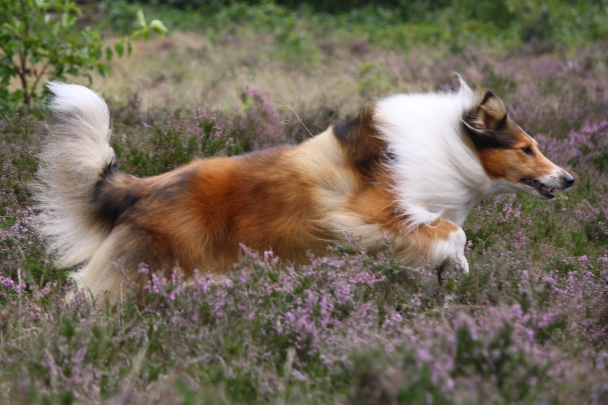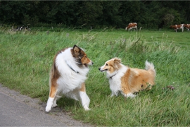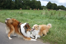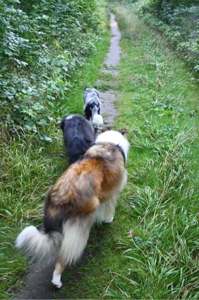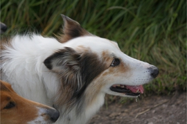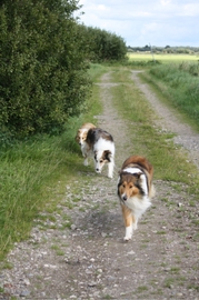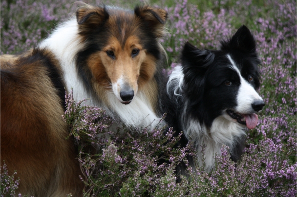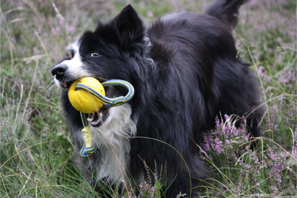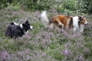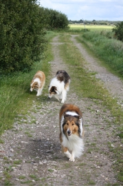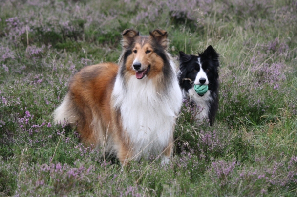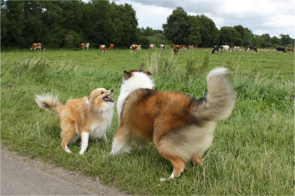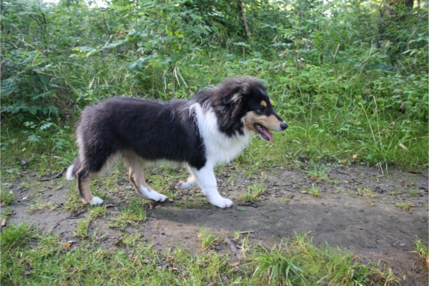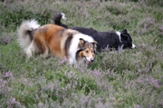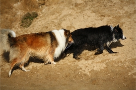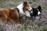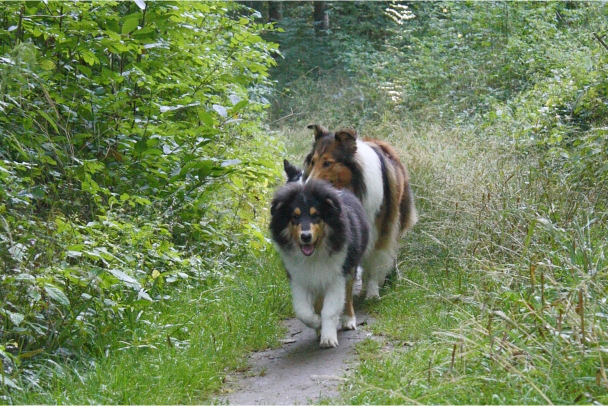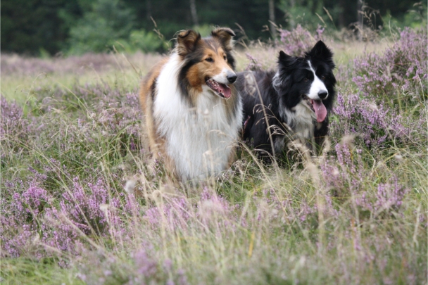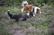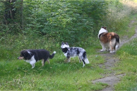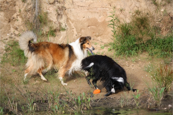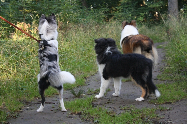 Ronja hatte die Wochen mit Spielverbot hinter sich. In der Zeit hatten wir uns anfangs trotzdem noch regelmäßig mit Juri zur Morgenrunde getroffen, aber es waren Spaziergänge an der Leine. Dann paßte es auch zeitlich eine Weile nicht zusammen. Und nun stieg Juri plötzlich nicht mehr alleine aus dem Auto aus. Es hatte Zuwachs gegeben: Colliewelpe Dusty.
