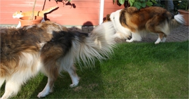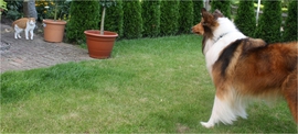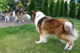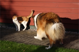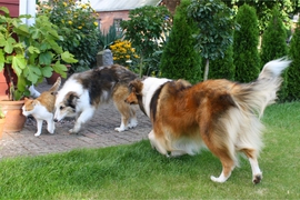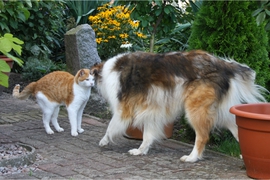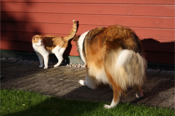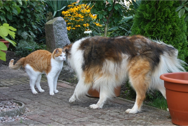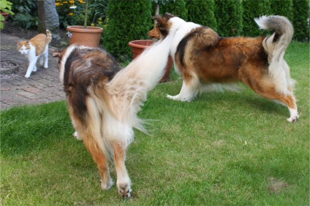 Zuerst mal war sie irritiert, das Kimmy und Gavin ihren Kater begrüßt und gar nicht verjagt haben. Ronja war da jedenfalls schon im Verjagemodus mitgerannt :-) Kimmy hat Ronja dann aber gut zu verstehen gegeben, das der Kater unter ihrem Schutz steht. Erst als Ronjas jagdliche Aufregung weit genug einer ruhigeren Neugier gewichen war, durfte sie gucken gehen. Ronja war sichtlich erstaunt: riecht wie Katze, aber benimmt sich nicht so, und dadurch auch verunsichert seeehr vorsichtig :-) Der Kater war absolut cool!
