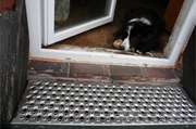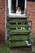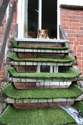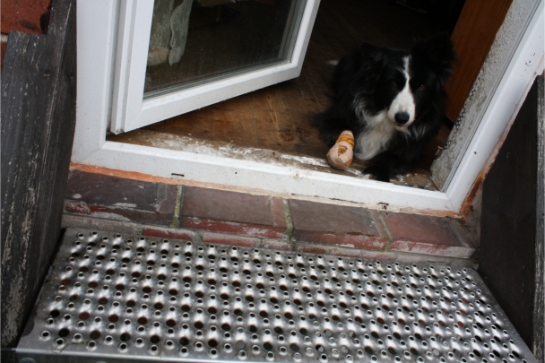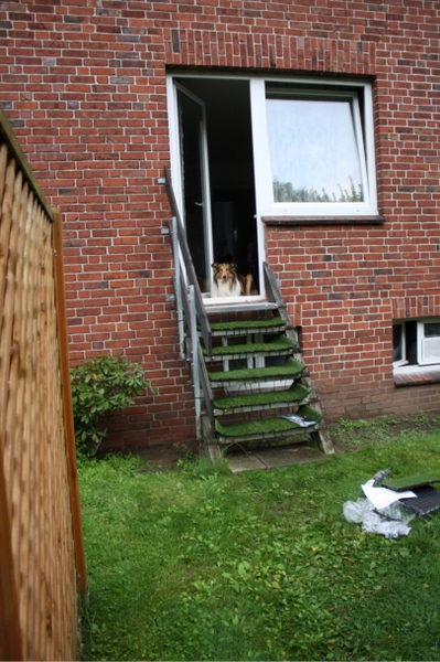 Ich hatte grad ein paar Tage frei, als Annouk spät abends beim Treppenstufen runter gehen plötzlich schreiend den Rest der Treppe runter gefallen ist. Sie hatte sich die Kralle abgerissen. Blutstillung über Eintunken in ein Glas mit Alkohol hat sie tapfer über sich ergehen lassen, und am nächsten Morgen ging es zum Tierarzt, wo es einen professionellen Verband gab. Dann habe ich mich endlich daran gemacht, die Schutzabdeckung auf den Stufen zu erneuern. Unsere alte war nämlich so marode gewesen, das Annouk da tatsächlich in eines der nicht mehr bedeckten, scharfkantigen Löcher geraten war.
