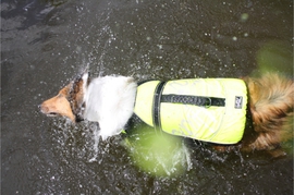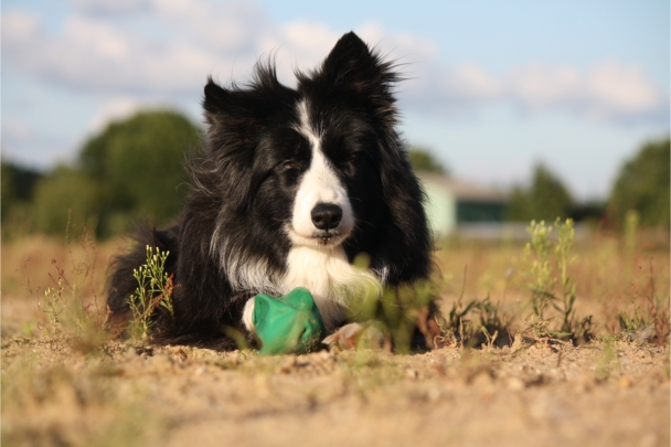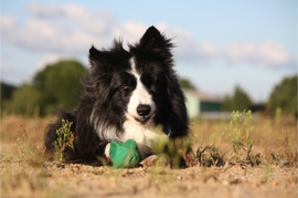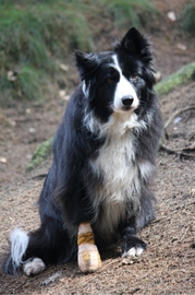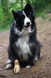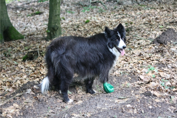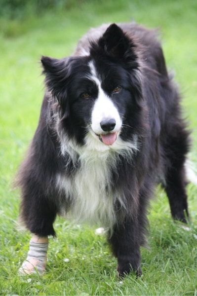 Die Akupunktur hatte Annouk mal wieder gut geholfen (außerdem gab es bald danach auch einen Besuch bei der Tierheilpraktikerin...). Am Morgen bevor wir zum Verbandswechsel beim Tierarzt waren hatte es so heftig geregnet, das plötzlich der Weg teilweise eher ein Bächlein war, und der Verband absolut aufgebraucht war. Da haben wir mit dem neuen Verband gleich einen tollen Überziehschutz bekommen.