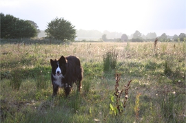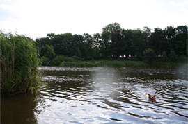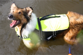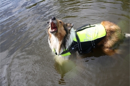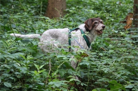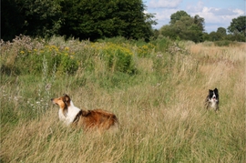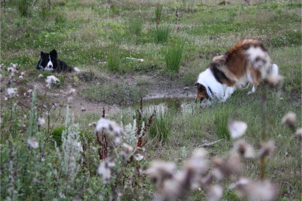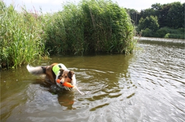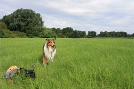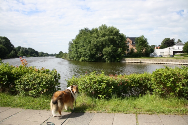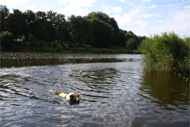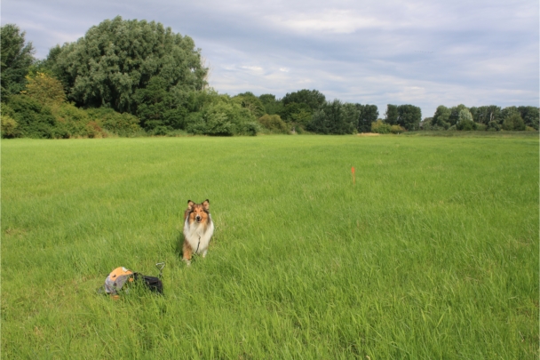 Annouk hatte inzwischen zwar den Verband ab, sollte aber noch nicht ins Wasser. Deshalb war Ronja auf der Vormittags Extra Runde alleine schwimmen. Auf der Stadtwiese hatte ich eine Fährte gelegt, die Ronja dann, nach Spaziergang an der Eider inclusive Schwimmen, fleißig abgesucht hat.