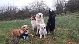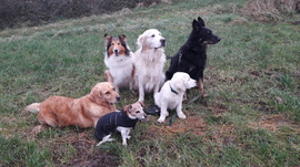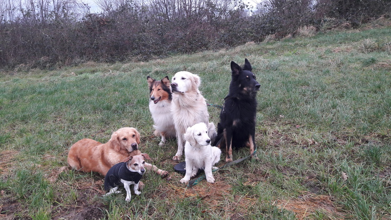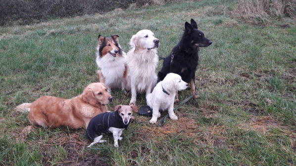Gruppenfotos mußten dann natürlich auch sein. Zwar waren die Gruppenfoto Routiniers nicht so ganz bei der Sache, aber die kleine Simba zeigte mit ihrer Ausdauer im Sitzen bleiben schon, das auch sie ein Gruppenfoto Routinier werden wird. Und irgendwie macht Ronja sich ganz gut in Danis Rudel. Sie ist so ein bißchen zwischen dem Altdeutschen Jack und Retrievern, und hat vielleicht auch noch ein bißchen was von Prinzesschen Ginny.