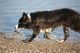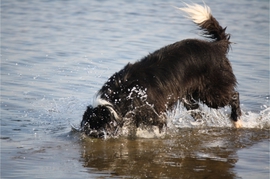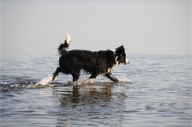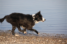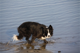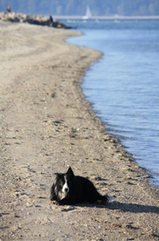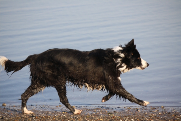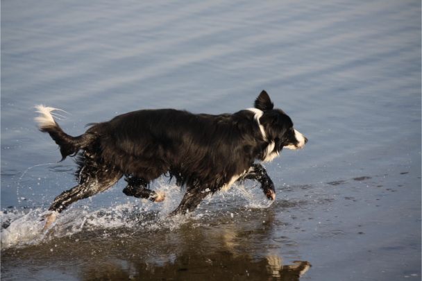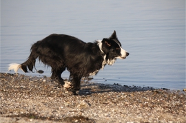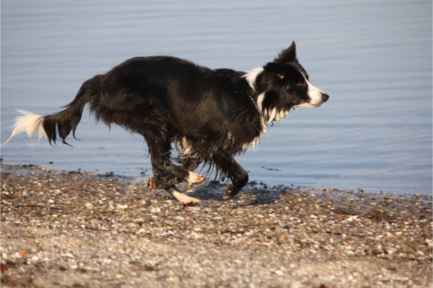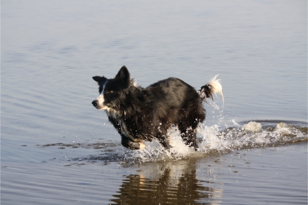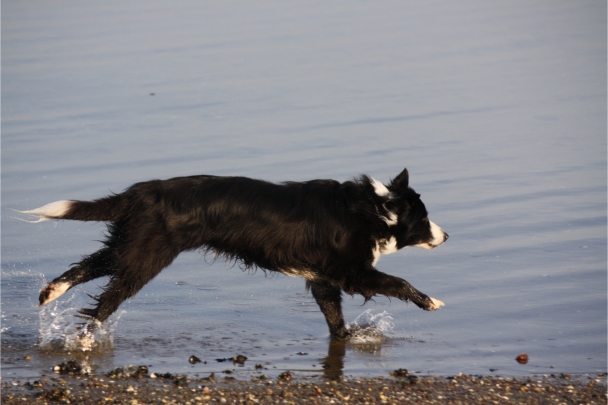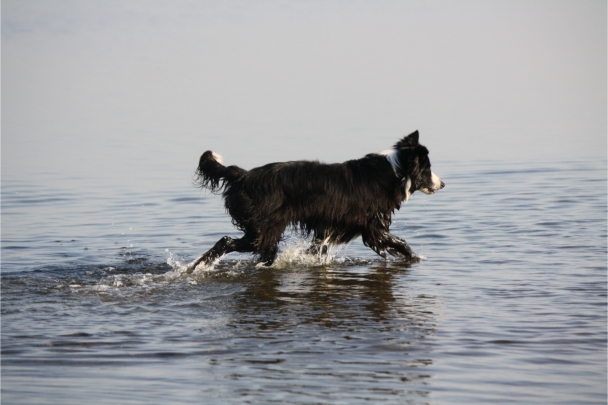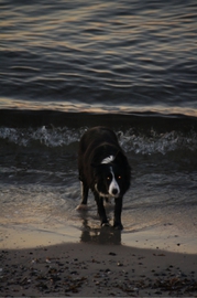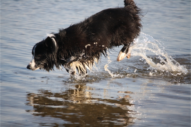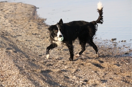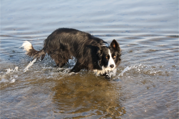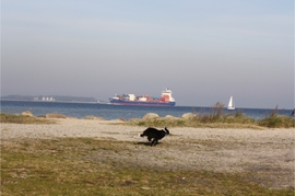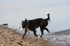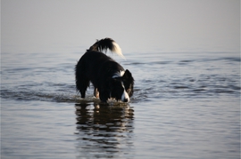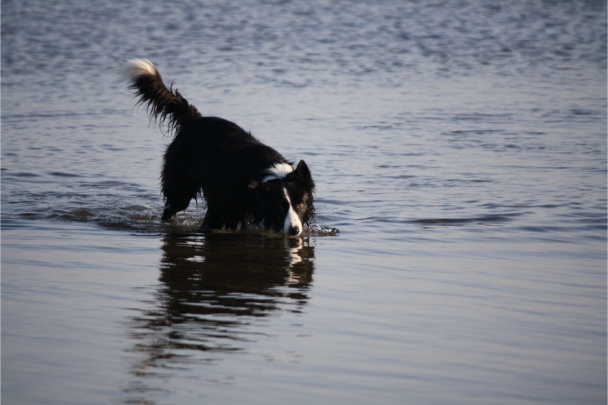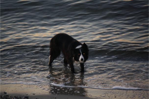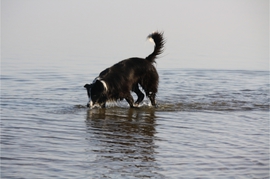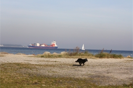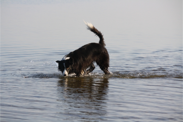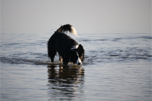 20. Oktober, morgens bei Laboe. Da hatte ich kein Schwimmspielzeug mit, deshalb gab es den Dentalball z.T. im niedrigen Wasser zu erschnüffeln und ertauchen.