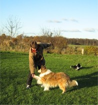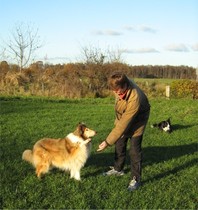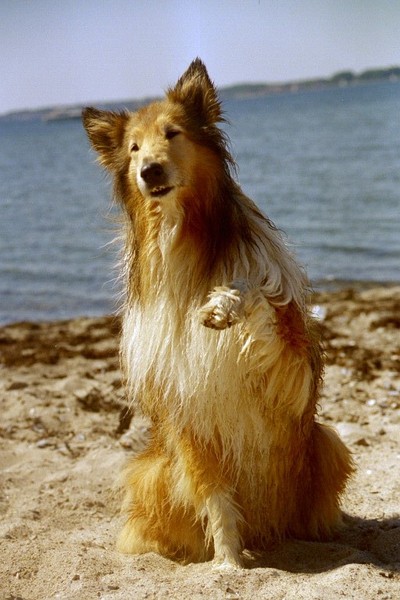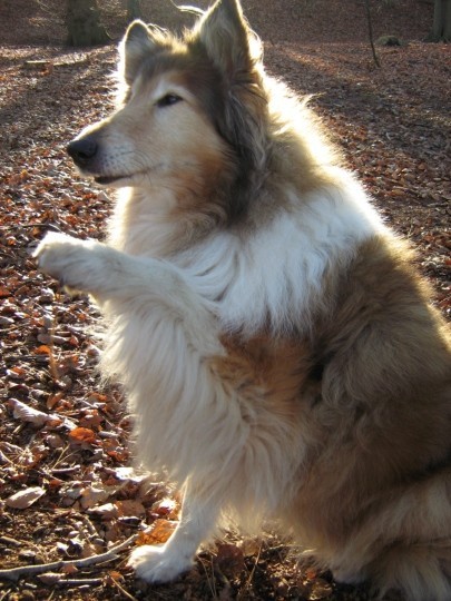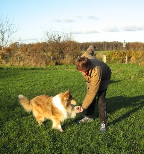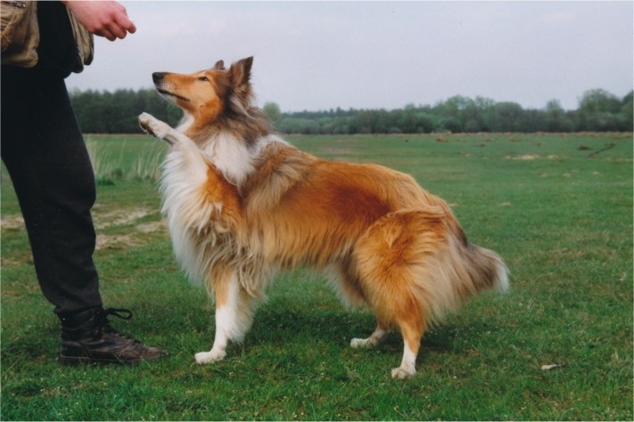 Mit beiden Vorderpfoten abklatschen und beide Vorderpfoten im aufrechten Stand in die Hände geben als Anfangs- und Endpose
